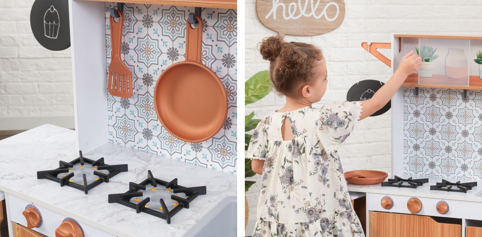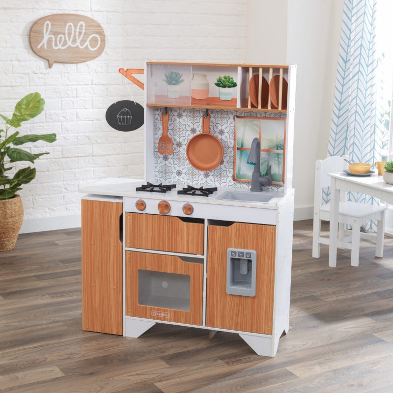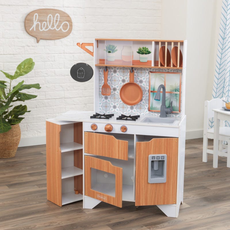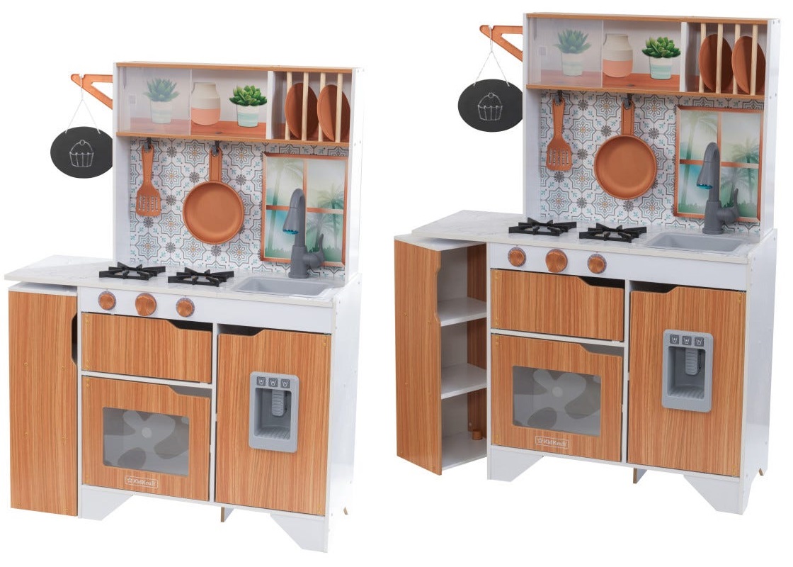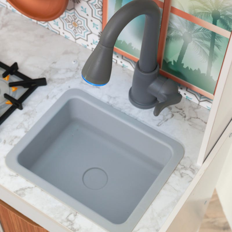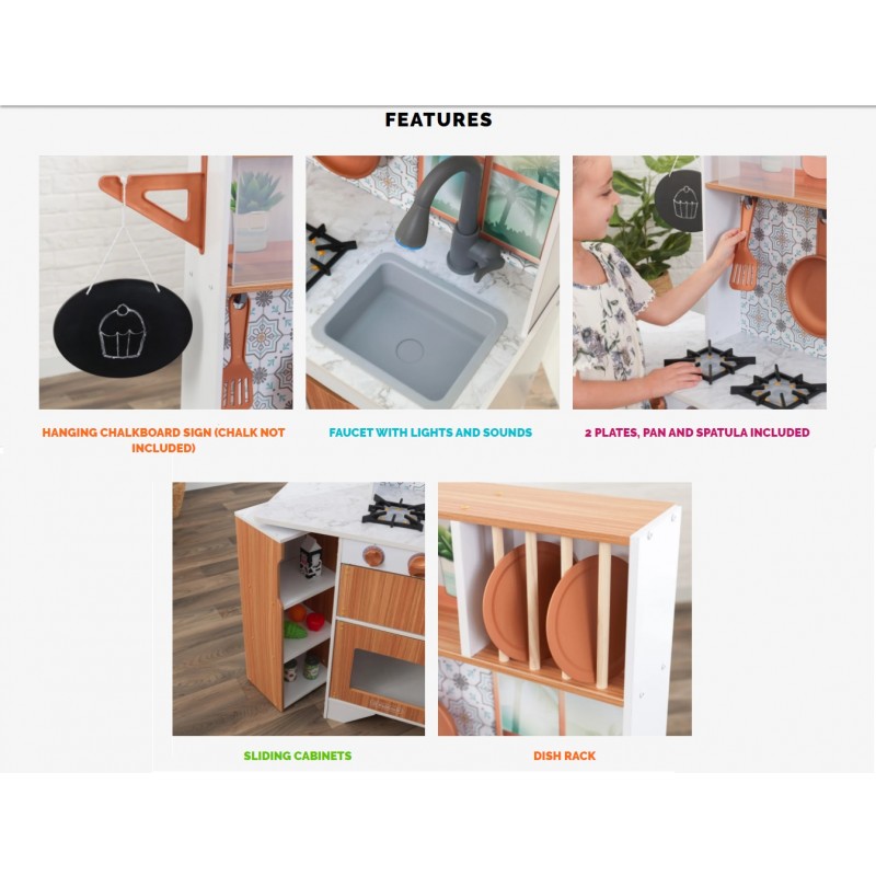 Este timpul să gătești cu stil! Bucătăria KidKraft Taverna Play este simplă și elegantă, gata să inspire meniuri noi cu o creativitate extremă. Blaturile mod marmură-esque adăpostesc două arzătoare, o chiuvetă și un robinet cu lumini și sunete. Minunatul backsplash este fundalul perfect pentru a afișa spatula și tigaia incluse pe cârlige.