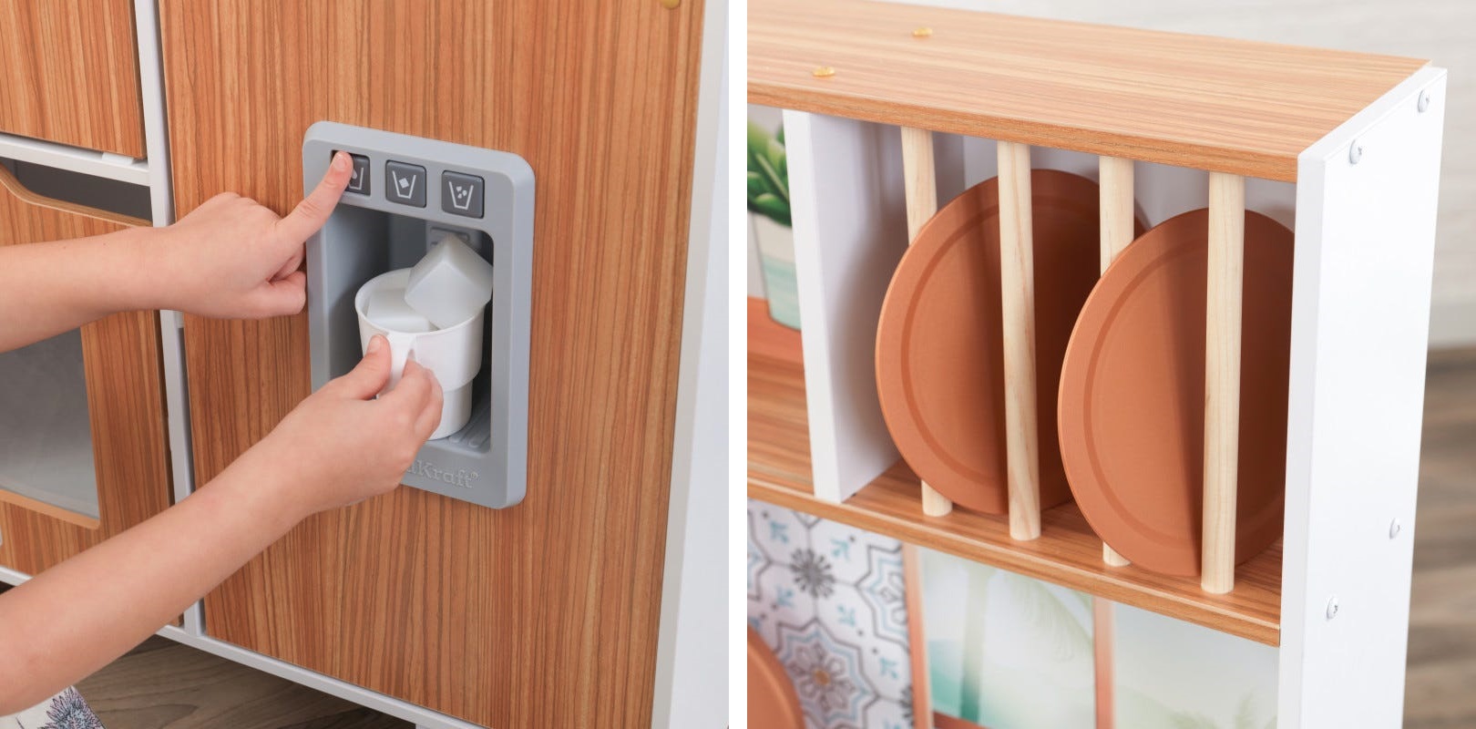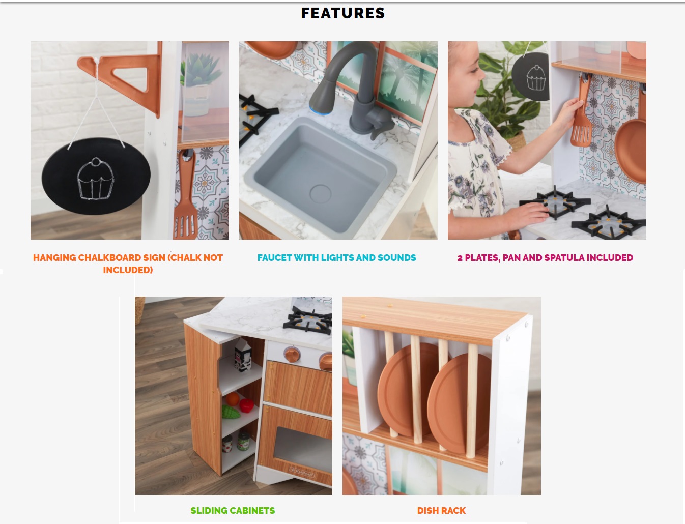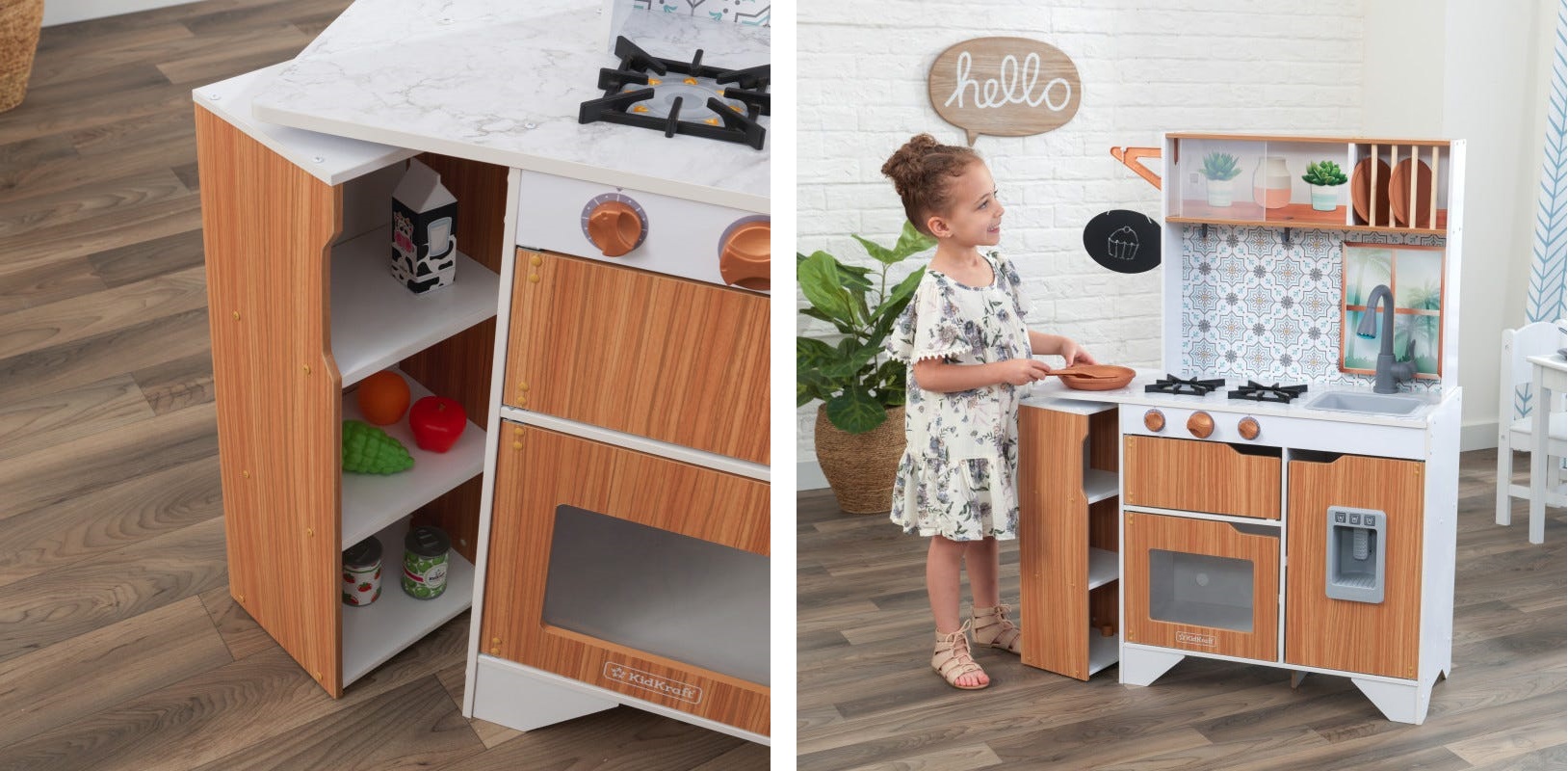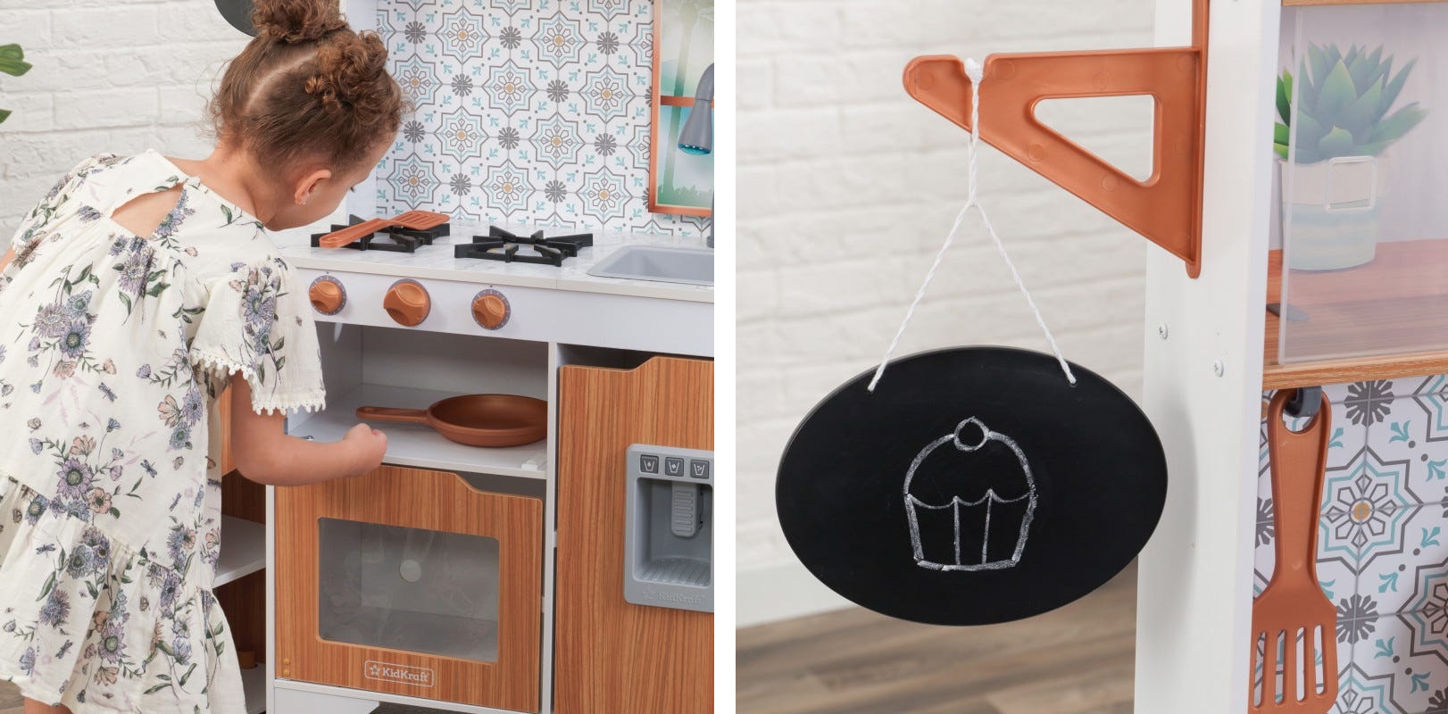 Este timpul să gătești cu stil! Bucătăria KidKraft Taverna Play este simplă și elegantă, gata să inspire meniuri noi cu o creativitate extremă. Blaturile mod marmură-esque adăpostesc două arzătoare, o chiuvetă și un robinet cu lumini și sunete. Minunatul backsplash este fundalul perfect pentru a afișa spatula și tigaia incluse pe cârlige.