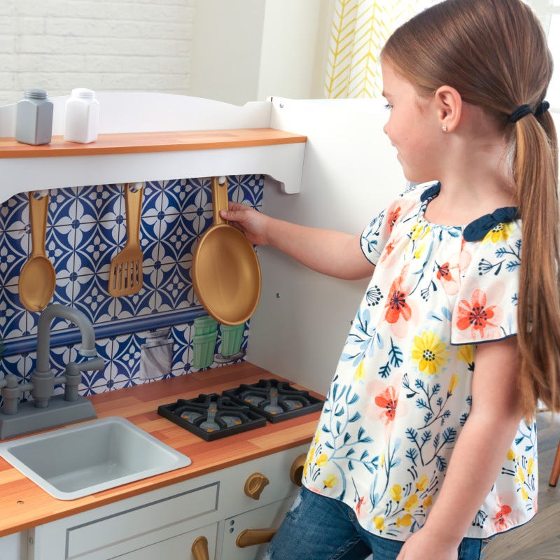 Joaca cu aceasta bucătărie KidKraft Mosaic Magnetic Kitchen Kitchen tocmai a devenit mult mai gustoasă, emoționantă și la modă ! Bucurați-vă de distracție pentru bucătarii mici, cu această bucătărie joacă deosebită, care este dotată cu detalii excepționale și caracteristici delicioase, inclusiv un frigider magnetic cu congelator de top, astfel încât copiii să poată decora cu magneți sau să pună la dispoziție liste de cumpărături. Nimic nu este mai răcoros decât producătorul de gheață de lucru care distribuie cuburi de gheață din plastic! Când copiii vor fi pregătiți să aprindă aragazul sau cuptorul, vor fi încântați să afle că butoanele fac un sunet distractiv dând clic când sunt întoarse. Deoarece creațiile culinare sunt la cuptor sau cuptor cu microunde, copiii pot arăta cu mândrie tatălui și tatălui ceea ce fac prin ușile vitrinei! Cu un set accesoriu format din 6 bucăți, o chiuvetă spațioasă și un design adorabil al gospodăriei, KidKraft Mosaic Magnetic Play Kitchen este un plus perfect pentru dormitorul echipat de joacă pentru micutii bucătari!