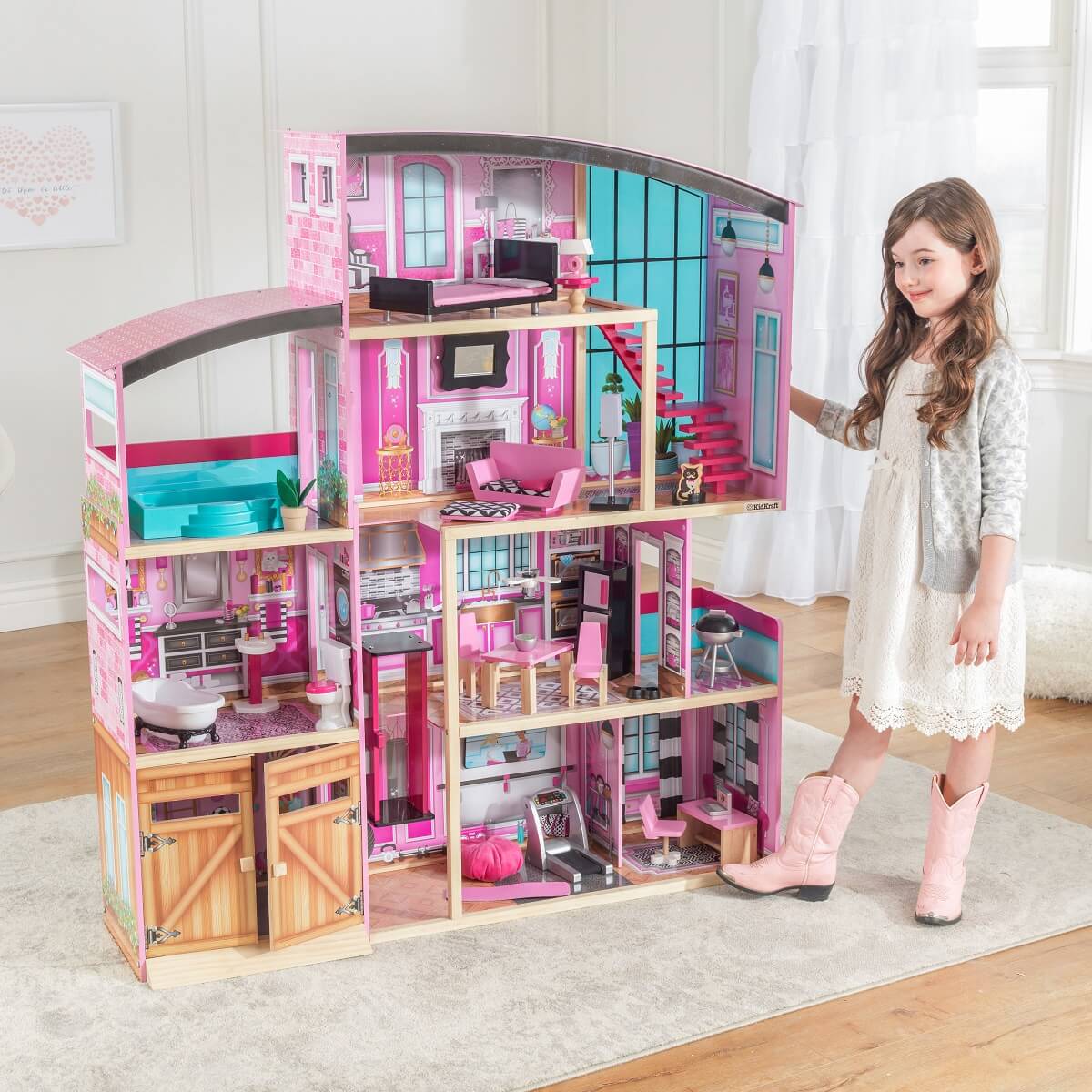Dream House – KidKraft Shimmer Mansion este una dintre cele mai moderne, complete, tonice, fabuloase , casute pentru papusi ...privind-o, ai putea spune ca este perfecta, ca nu-i lipseste nimic, decat entuziasmul si bucuria unui copil care sa ii dea viata cu imaginatia si creativitatea sa. Casuta, dispusa pe patru niveluri, cu o inaltime de 135 cm, putand acomoda papusi de cel mult 30 cm, exceleaza la capitolul detalii, avand si cateva accesorii unice (pe care nu le poti intalni la celelalte casute – ex, saltea gimnastica si banda de alergat), accesorii cu led, cu sunete si lumini, toate aceste detalii plasand-o in topul casutelor preferate de copii. Cele noua camere (8 camere&1 in saptiu liber) ale casutei, au un specific, aparte, atractiv ca design si specific/mobilier, cu o coloristica roz, care face ca fiecare camera sa straluceasca si sa genereze o poveste in sine. La toate acestea se adauga liftul glisant roz, care face ca povestea sa alunce usor si sa se continuie ca timp si spatiu intre cele 3 niveluri pe care le interconecteaza. Si ca povestea sa se termine frumos, tot decorul este completat de un fabulos SPA pe balconul acoperit al nivelului 3. O scară modernă de la nivelul 3, te poate ajuta sa ajungi in dormitorul de la ultimul nivel, pentru cateva momente de relaxare, dar si pentru o priveliste magnifica. Setul de 30 de accesorii include si piese ca: mobilier din lemn pictat manual, rama-unde iti poti insera propria poza,TV cu ecran plat, accesorii care pot ajuta la constientizarea unui stil de viata cu adevarat sanatos (ex.: vas cu salata). Shimmer Mansion DollHouse – este casuta care poate aduce un plus nu doar in bucuria orelor de joaca dar poate fi si un excelent suport pentru invatarea unor obiceiuri si atitudini sanatoase, fiind o casuta ce se va diferentia de fiecare data cu usurinta.