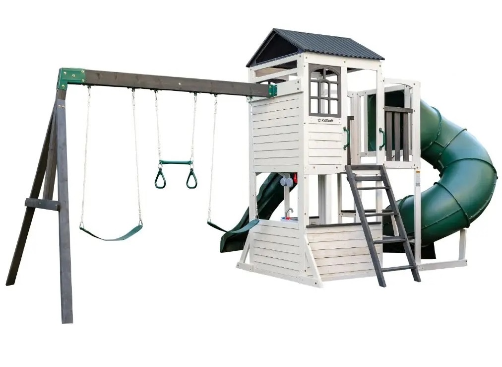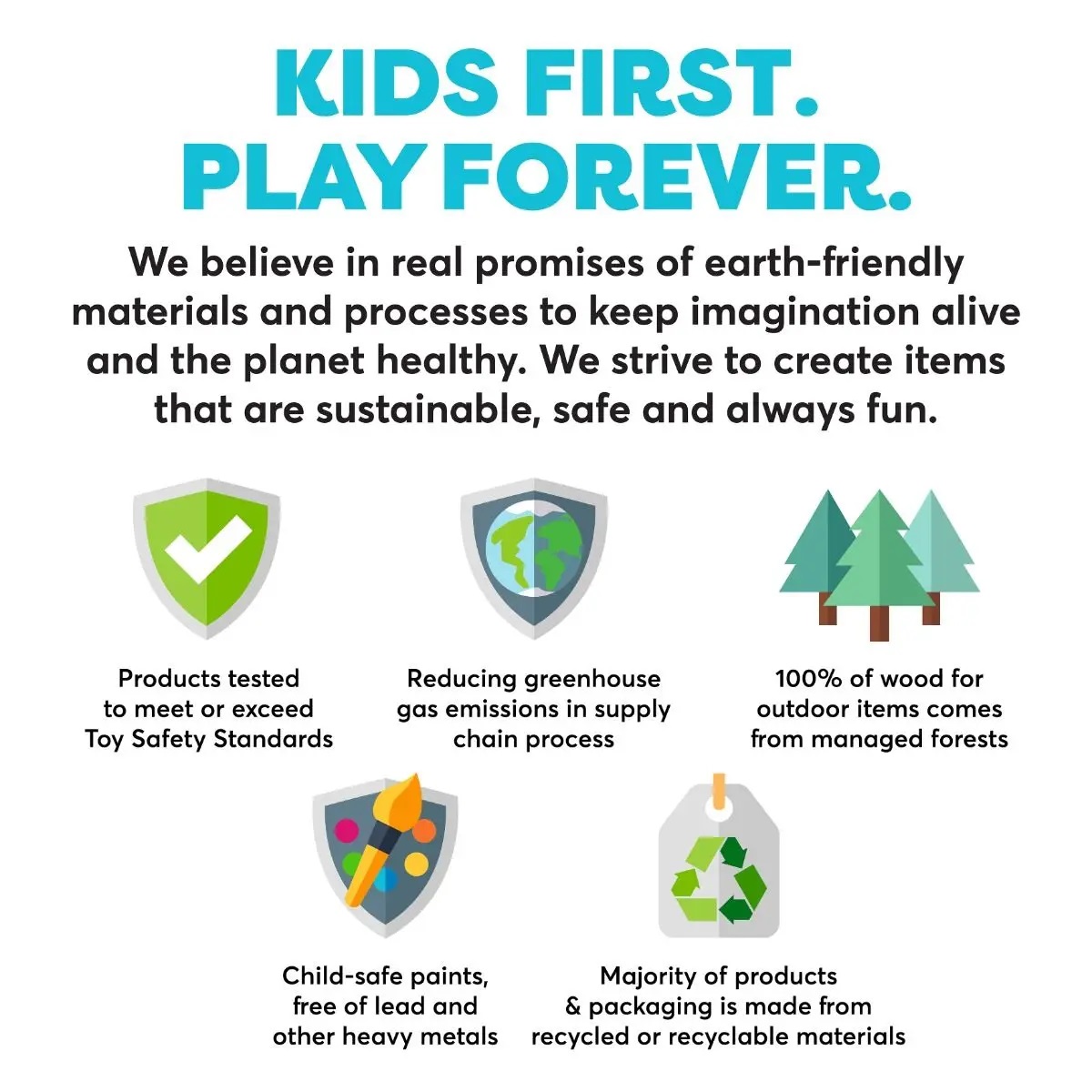 Dati frâu liber în spațiul larg deschis al curții din spate cu noul complex de joaca cu Casuta Cozy – Wrangler Way — o combinație unică de căsuță și set de joacă într-un set atractiv din lemn. „Home on the range” este mantra acestei structuri de joacă extinse, care include un club cu două etaje, cu tablă albă, unde copiii pot juca rol fiind pionierii în prerie. Chicineta actualizată include chiuvetă, robinet, arzător și accesorii, astfel încât copiii să poată găti mâncăruri mai moderne și imaginative. Urcă-te pe scară și apoi coboară folosind una dintre cele două tobogane: fie toboganul curbat tunel, fie toboganul ondulat în aer liber. Amplificați acțiunea cu un galop pe unul dintre cele trei leagăne - un mod sigur de a simți briza și de a pune zâmbete pe fețe. Luați o încărcătură de la masa și băncile atașate. Locația sa sub puntea superioară oferă copiilor o locație umbrită pentru gustare sau răcire. Fabricat din lemn durabil și acoperit cu pete pe bază de apă potrivite pentru copii, acest set este creat pentru a rezista în timpul anotimpurilor.
