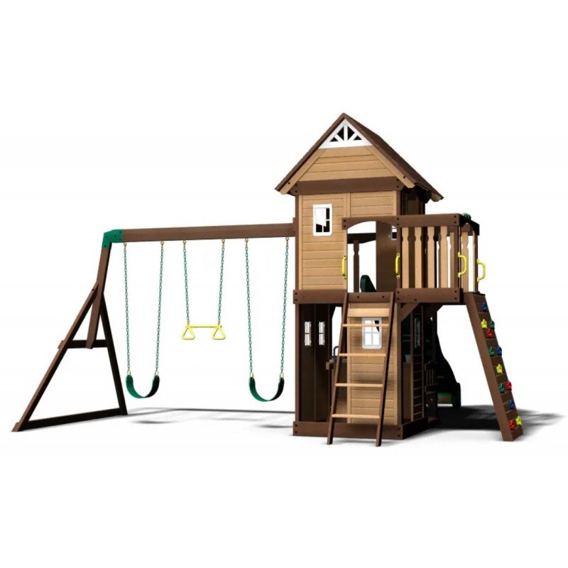 Micii tăi căutători de aventuri se vor simți foarte împliniți după ce vor juca pe Muntele Triumf. Cu practic o casă de joacă completă dedesubt (completată cu chiuvetă, aragaz si un set suplimentar de accesori incluse mâncare din plastic și o zonă de picnic pentru 4 persoane) și o casă de club completă deasupra, cu propriul telescop și volan, este posibil să nu observați nici măcar leagănele de pe acest set de leagăn! Zidul de alpinism provocator și scara de intrare cu trepte plate oferă tuturor o modalitate rapidă, sigură și distractivă de a merge la clubul spațios superior, balcon și terasă.