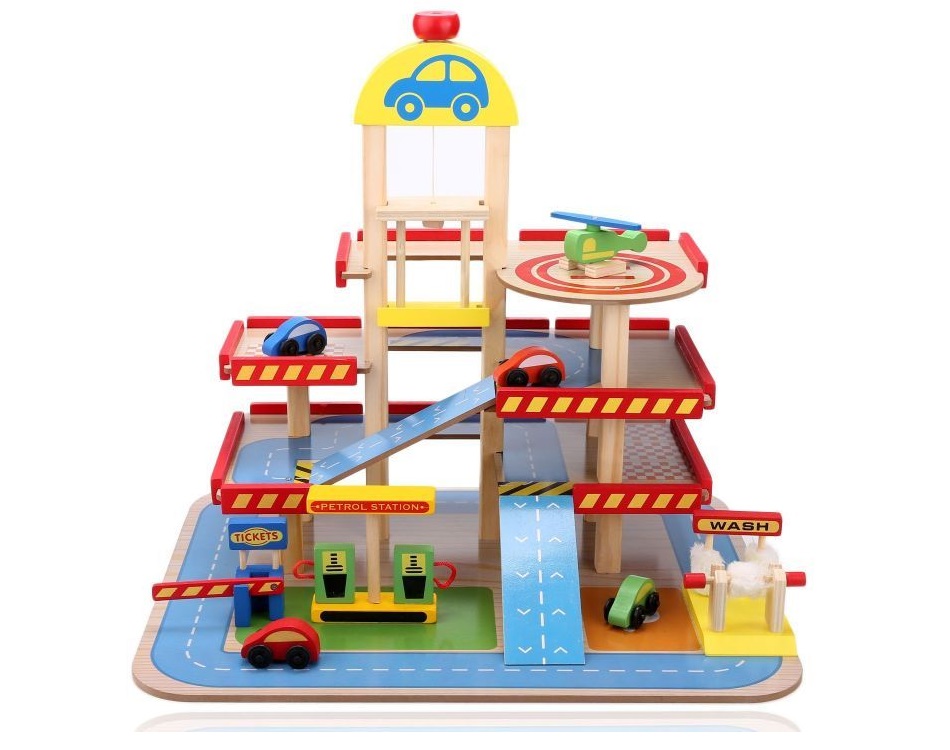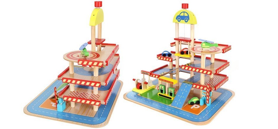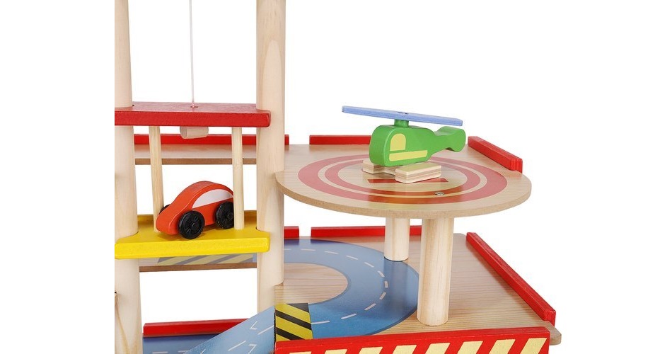 Jucăria este construită pe 3 nivele inteconectate cu rampe si străzi pe care pot circula mașinile. Garajul este echipat cu un lift mobil care este pus în mișcare prin rotirea butonului. Setul include 4 mașini din lemn și un elicopter. În plus, jucăria este echipată cu spălători auto pentru mașini, benzinării și o barieră. Toate elementele din lemn sunt sigure pentru copil, fără margini ascuțite și acoperite cu vopsea ecologică.