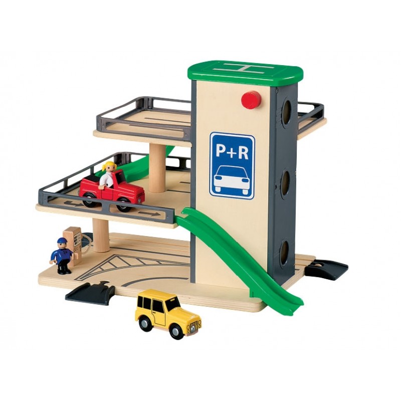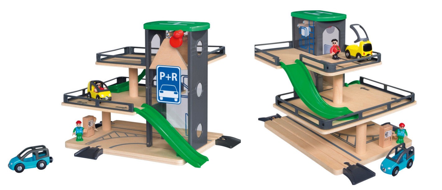 Garaj din lemn ce include doua rampe exterioare, ascensor pentru masinute, bariera mobila la intrarea in garaj si patru masinute din lemn.