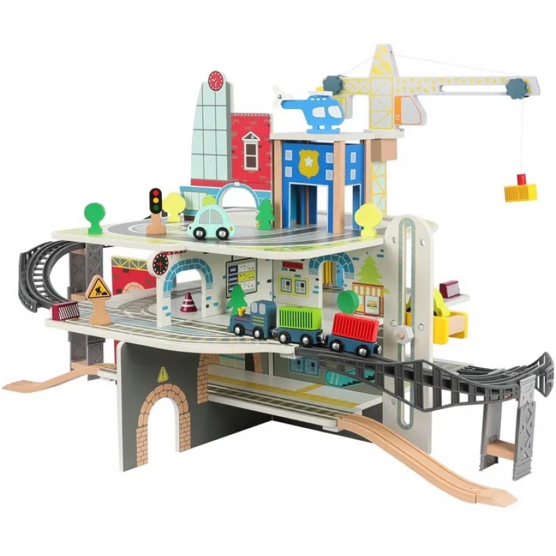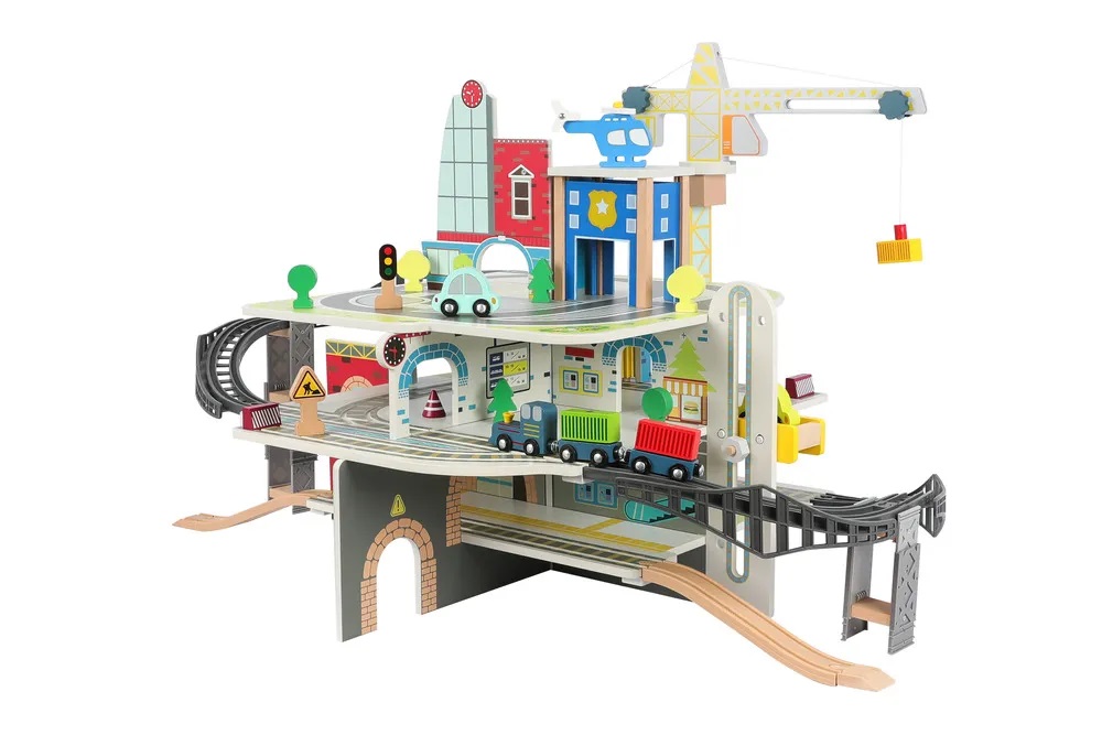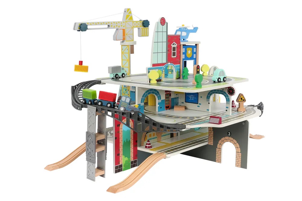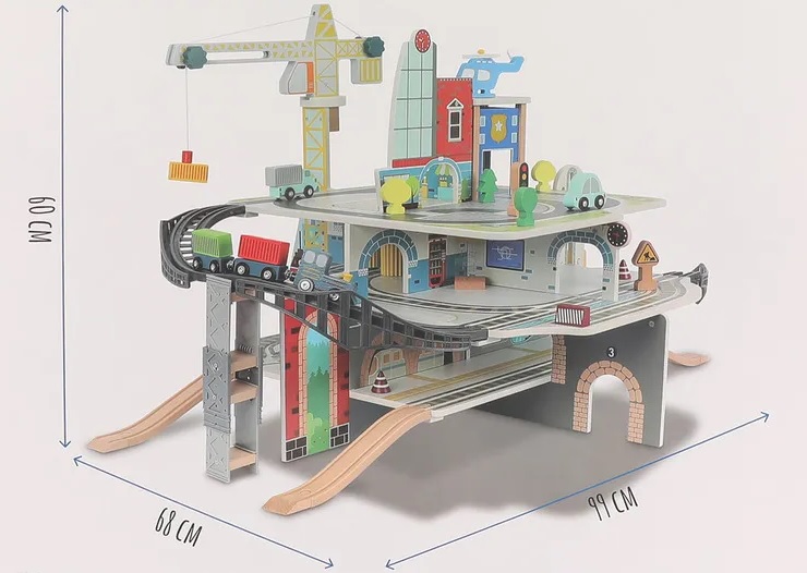 Un de joaca interactiv ce include rampe exterioare, macara, ascensor, spălătorie auto, benzinarie, elicopter cu heliport, etc.