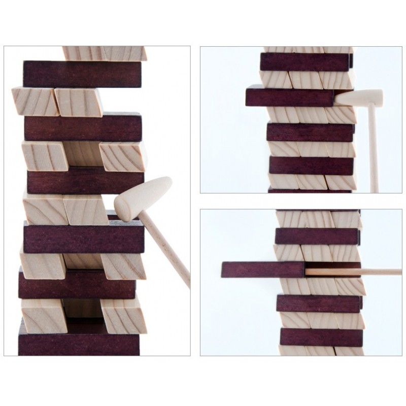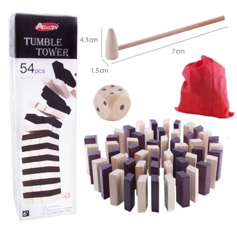 Jocul are 54 de piese, ciocanel pentru detasat cuburile din turnulet si zar.