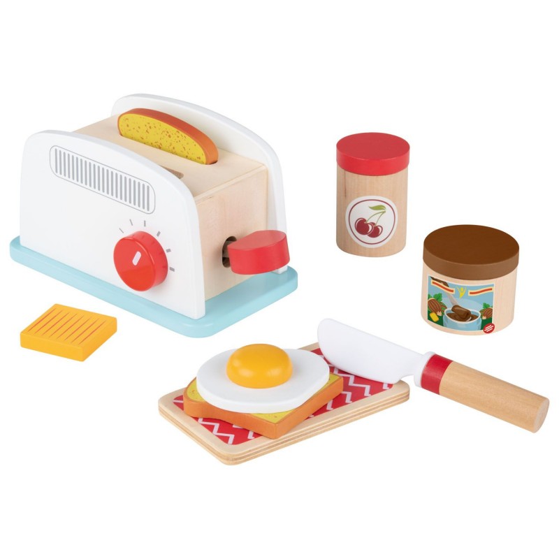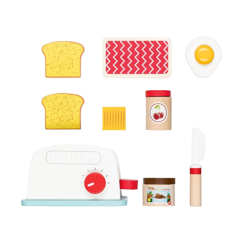 - Buton de control rotativ din plastic și funcție pop-up, 2 felii de pâine prăjită, ou prăjit, unt, borcan tartinabil și gem cu capac detașabil, tablă mică și cuțit de plastic cu mâner de lemn