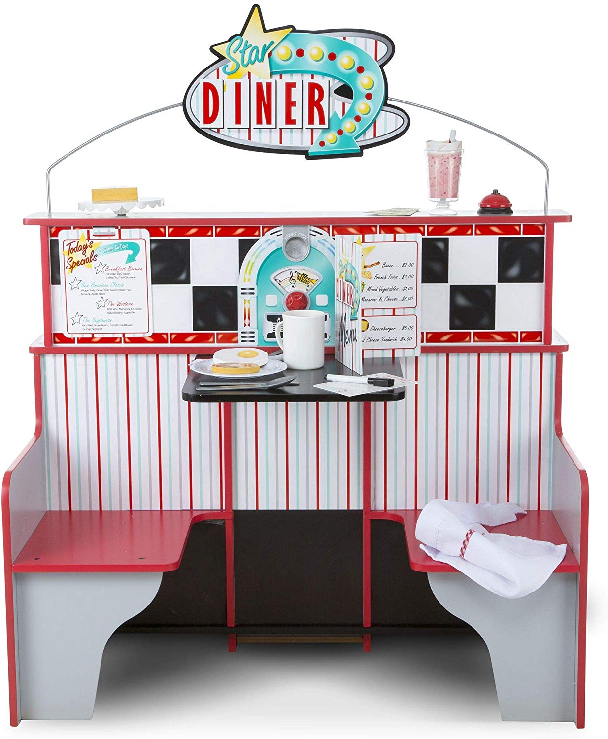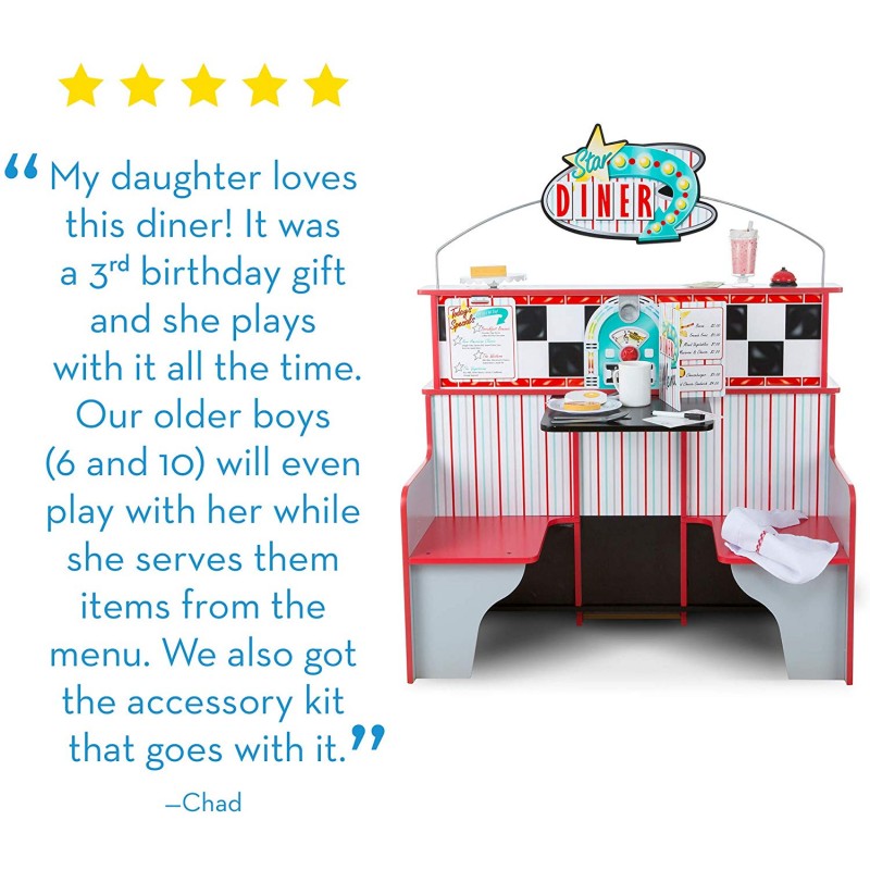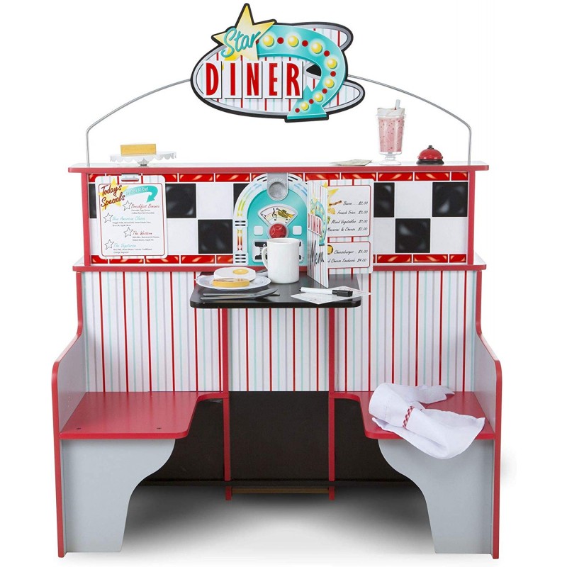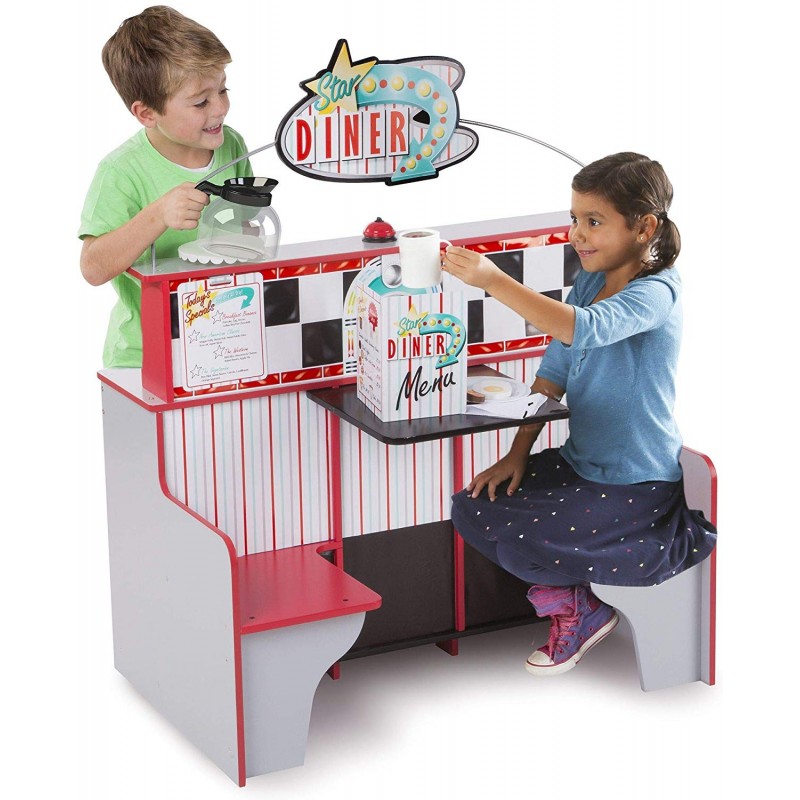 Este de două ori distracție la Star Diner! Acest spațiu de joacă din lemn cu două fețe, robust, permite copiilor să gătească și să servească din partea bucătăriei și să comande și să se bucure de o masă pe partea de cabină. Bucătăria, cu un cuptor extra-mare, arzătoare și cadrane realiste, un frigider cu două rafturi și o mulțime de spații pentru contorizare oferă detalii amuzante precum un distribuitor de băuturi și un aparat de milkshake cu tijă de amestec care poate fi împinsă în sus și în jos. La cabina cu două locuri, clienții de trei ani și mai mari pot roti cadranul pentru a alege tipul de muzică preferat, apoi aruncați moneda inclusă în slot - iar moneda aterizează într-o tavă de colectare pe cealaltă parte!
