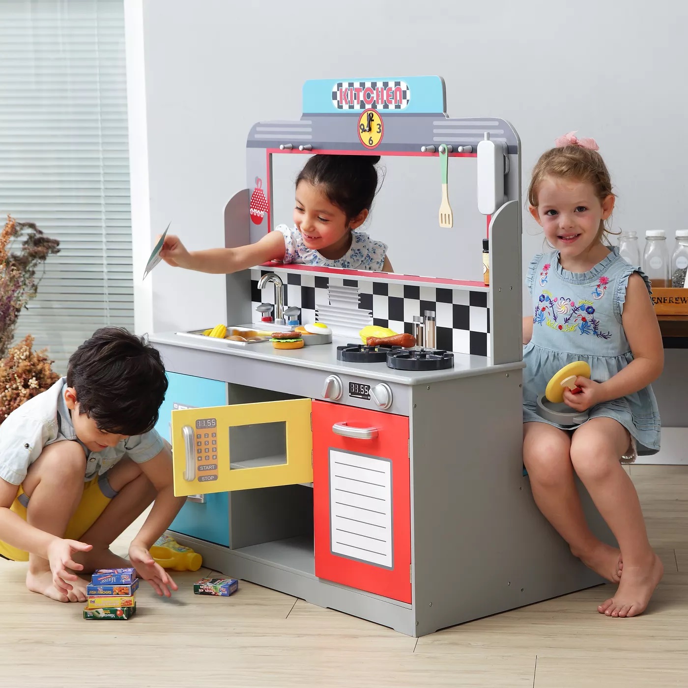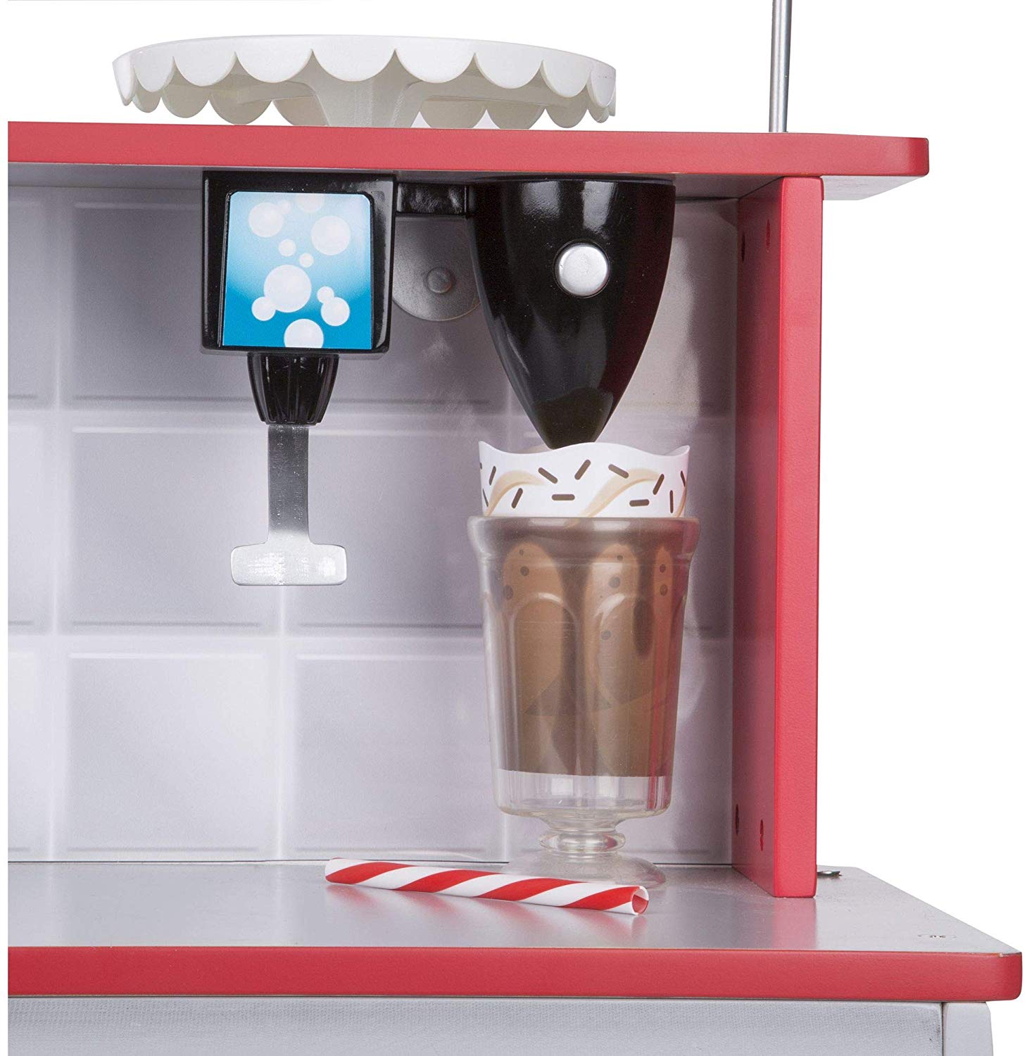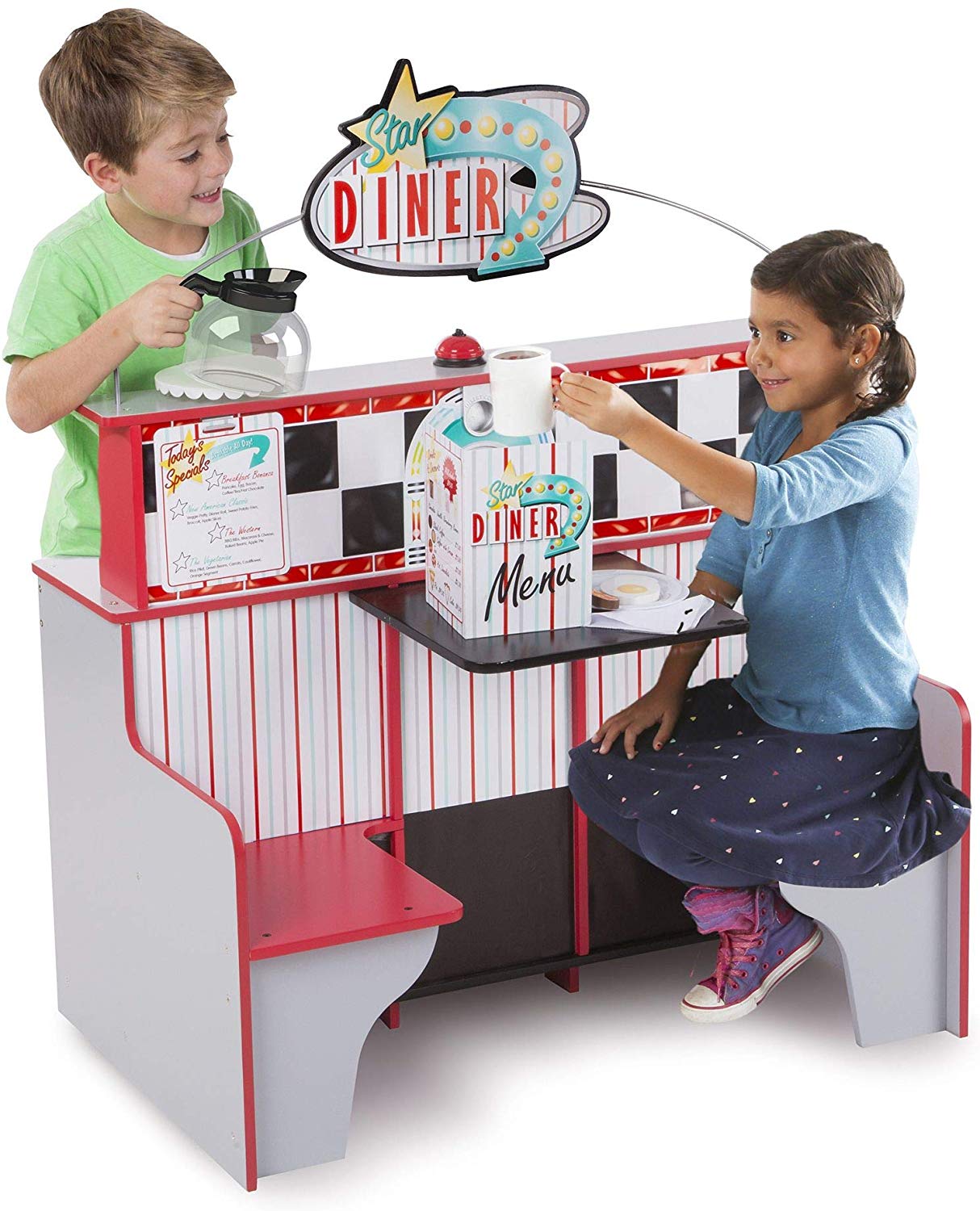 Este de două ori distracție la Star Diner! Acest spațiu de joacă din lemn cu două fețe, robust, permite copiilor să gătească și să servească din partea bucătăriei și să comande și să se bucure de o masă pe partea de cabină. Bucătăria, cu un cuptor extra-mare, arzătoare și cadrane realiste, un frigider cu două rafturi și o mulțime de spații pentru contorizare oferă detalii amuzante precum un distribuitor de băuturi și un aparat de milkshake cu tijă de amestec care poate fi împinsă în sus și în jos. La cabina cu două locuri, clienții de trei ani și mai mari pot roti cadranul pentru a alege tipul de muzică preferat, apoi aruncați moneda inclusă în slot - iar moneda aterizează într-o tavă de colectare pe cealaltă parte!