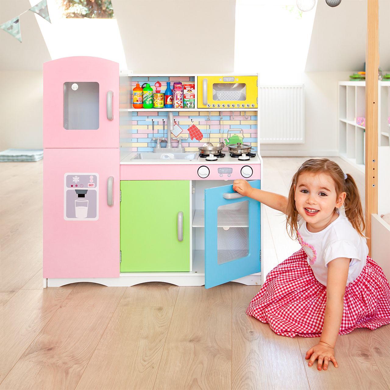 Bucataria Pastel este o bucatarie multicolorta in culori vii si atarctive din lemn ideala pentru Junior(ele/ii) MasterChef, plina de detalii grozave amuzante pentru copii, inspirate din bucatariile reale.