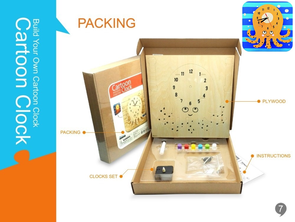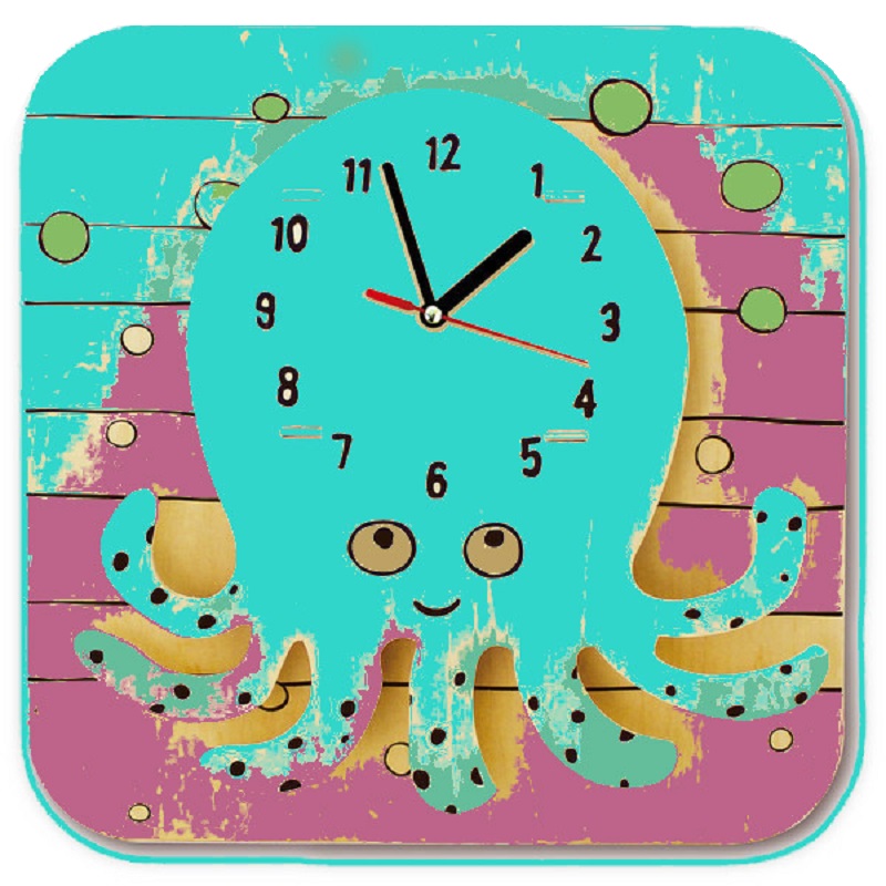 Produs: Ceas Caracatita – din lemn de construit si de pictat -cu meanism electronic si baterie – Build and paint your funny wall watch