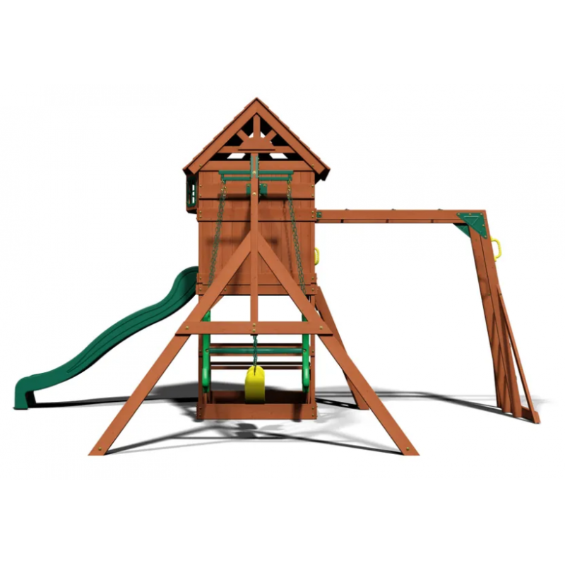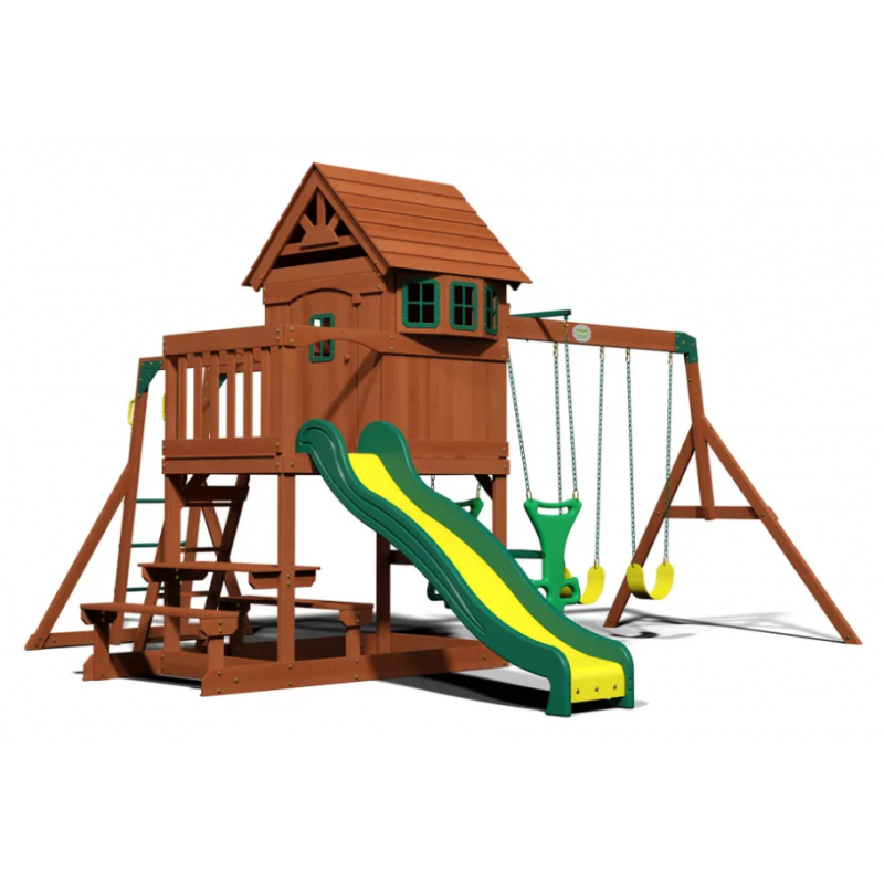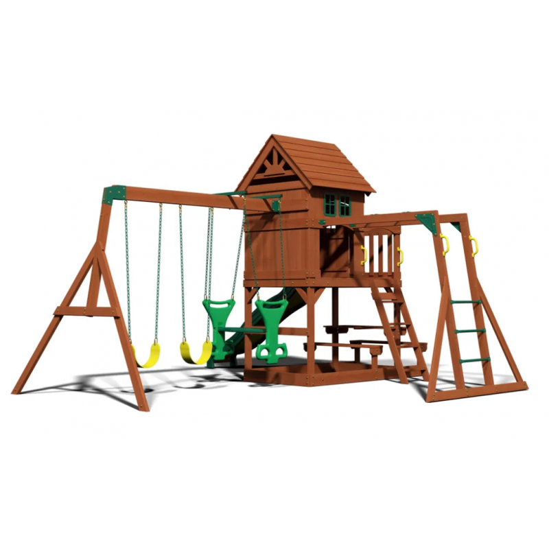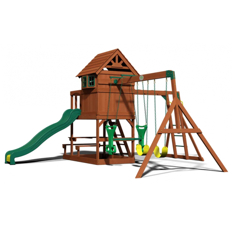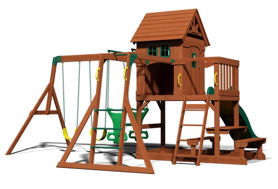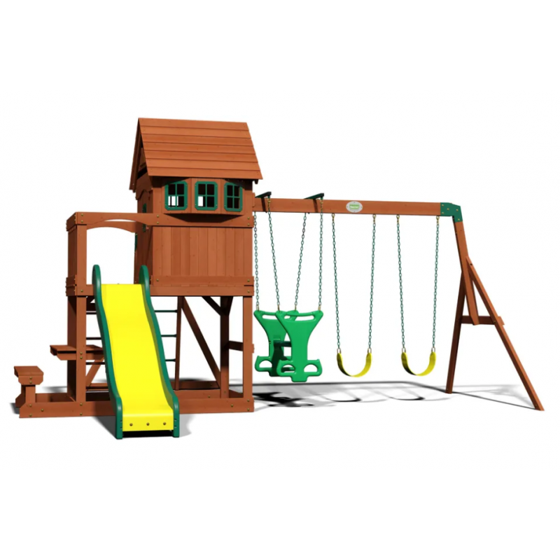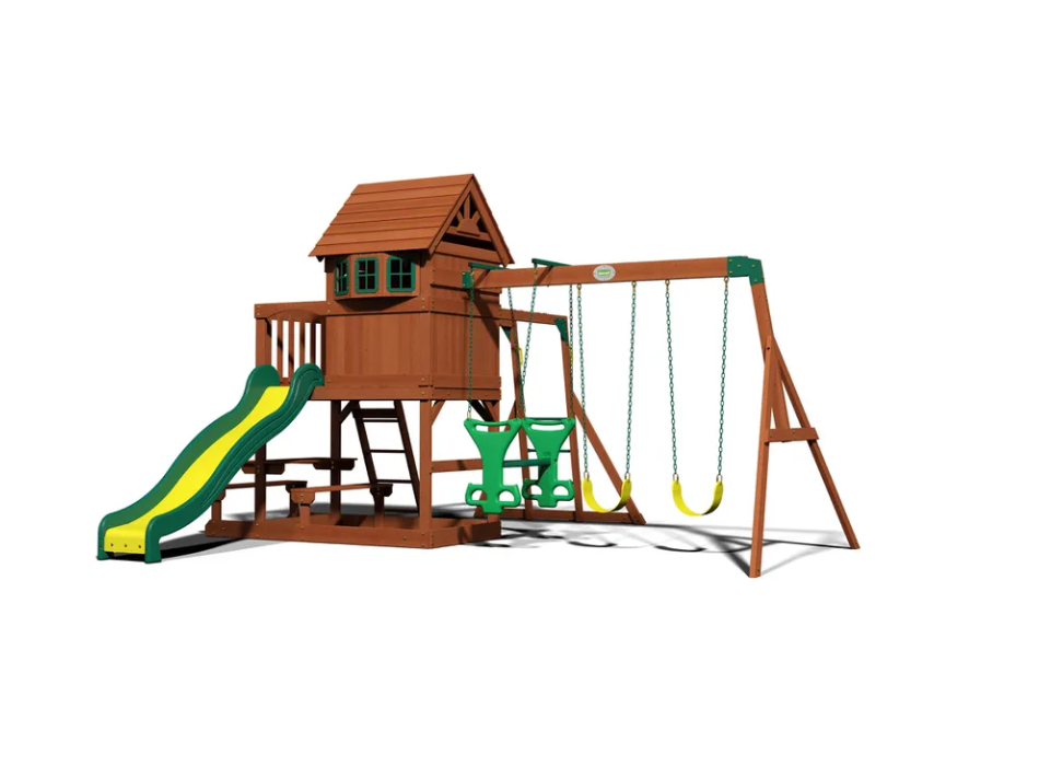 Setul de leagăne din lemn Springboro este plin de caracteristici, dar este încă perfect pentru grădini mici. Are Monkey Bar, are un club house superior, cu ferestre și balcon. La nivelul de jos există spațiu pentru o cutie de nisip și un raft de gustări / activități ce vor permite copiilor să se joace și să savureze câteva băuturi răcoritoare în același timp. O scară plată de intrare în trepte și un perete solid de piatră permit ca alpinismul să fie ușor sau provocator. Cu un topogan lung rapid si sigur de 243 cm lungime. Există două leagăne de centură și un leagan tip planor cu două persoane, astfel încât patru copii să se poată mișca dintr-o dată. Acest complex pe doua nivele de joaca cu leagăne si topogan va fi foarte distractiv pentru copii pentru anii următori!