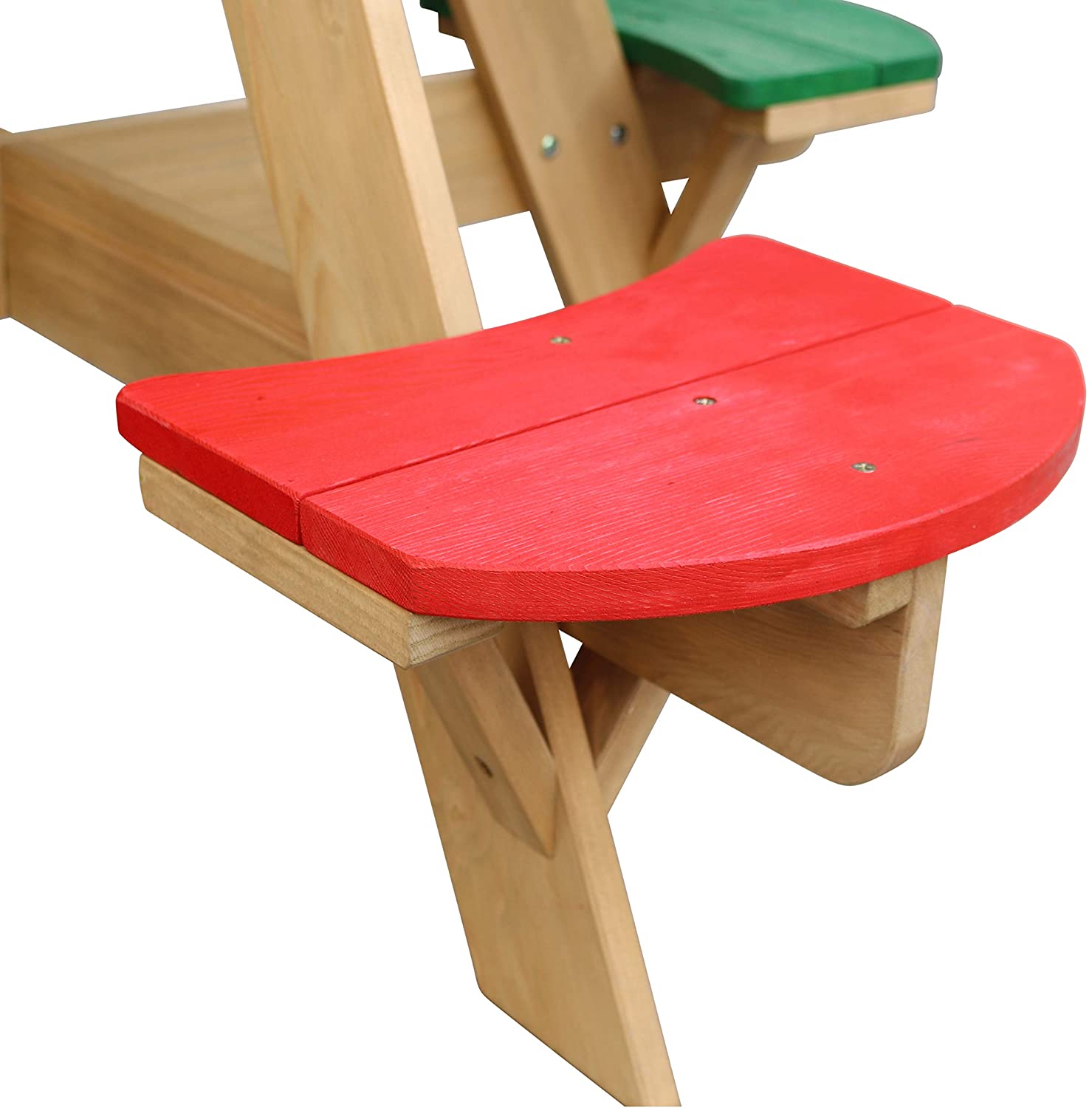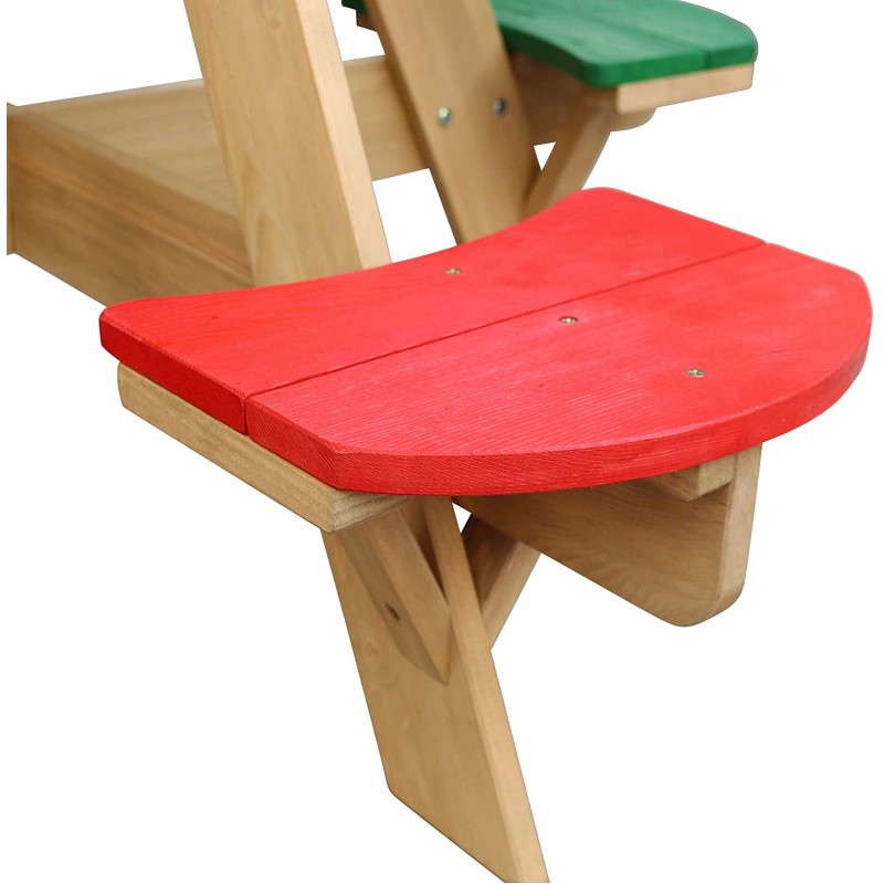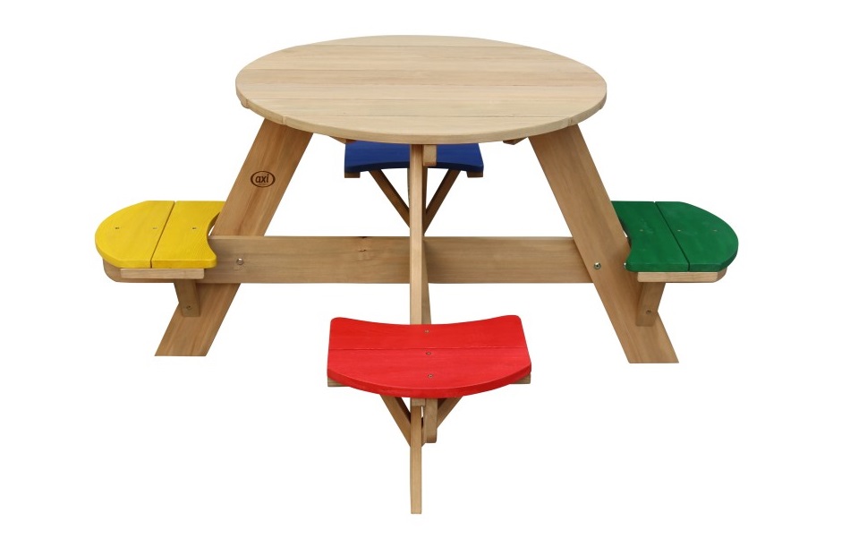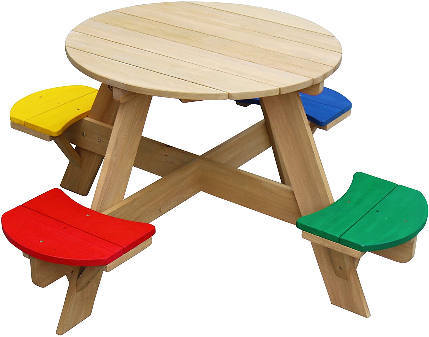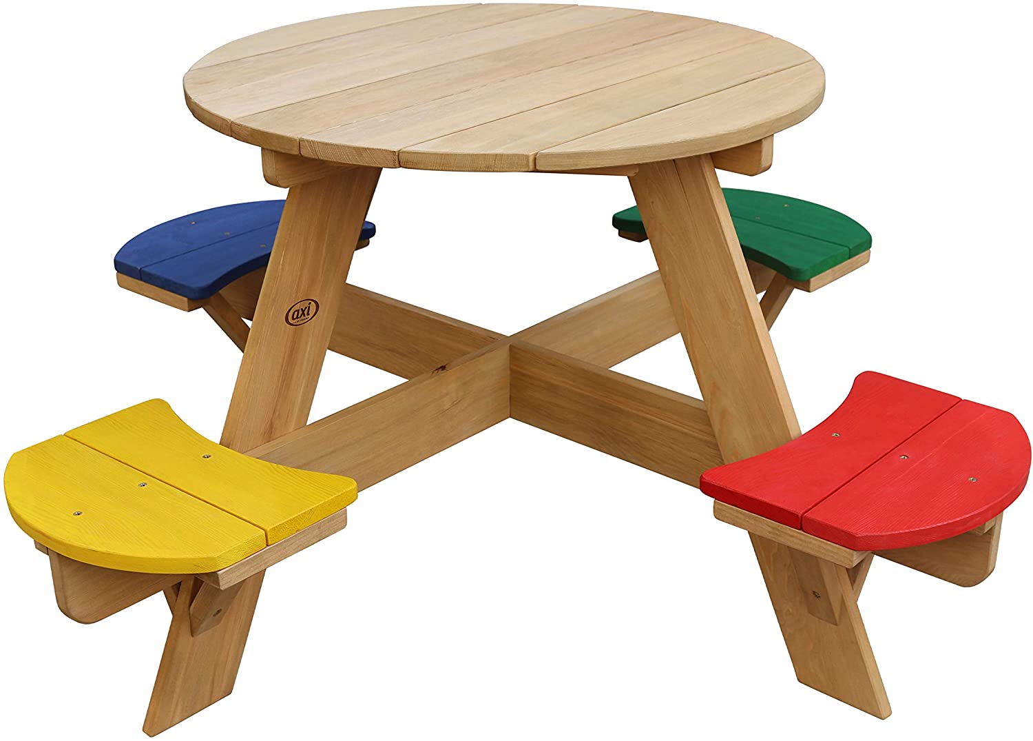 Acomodeaza până la patru copii să stea împreună, să se joace sau să sărbătorească următoarea petrecere de ceai cu prietenii la noua masuta pe picnic rotunda colorata in culorile curcubeului si in forma OZN. Setul de picnic este confecționat din lemn durabil si certificat FSC, rezistent la rupere, durabil și rezistent la intemperii. Cadrul setului are 4 scaune pe fond maro natur, iar suprafeța sezutului băncii și are mesei sunt tratate maro cu vopsea pe bază de apă, astfel încât caracterul lemnului este foarte frumos. evidentiind masuta pentru copii. Setul frumos de scaune pentru 4 copii are o înălțime a scaunului de 27 cm și este potrivit pentru vârstele de 18 luni și peste. Masa oferă spațiu generos în zilele frumoase de vară atunci când se joacă cu jucării și tot feful de activitati de masa in natura.