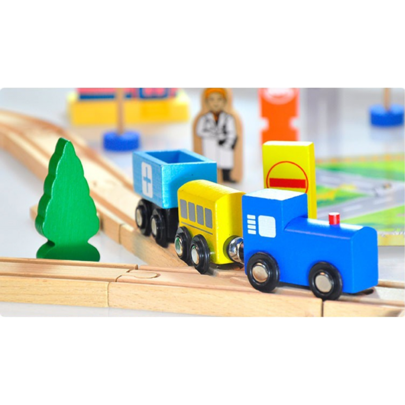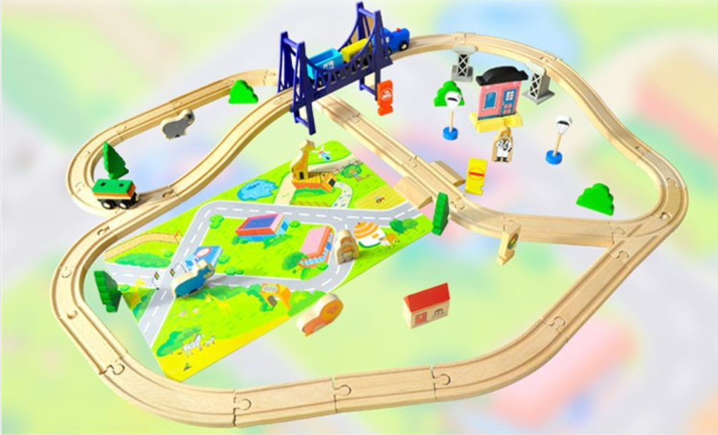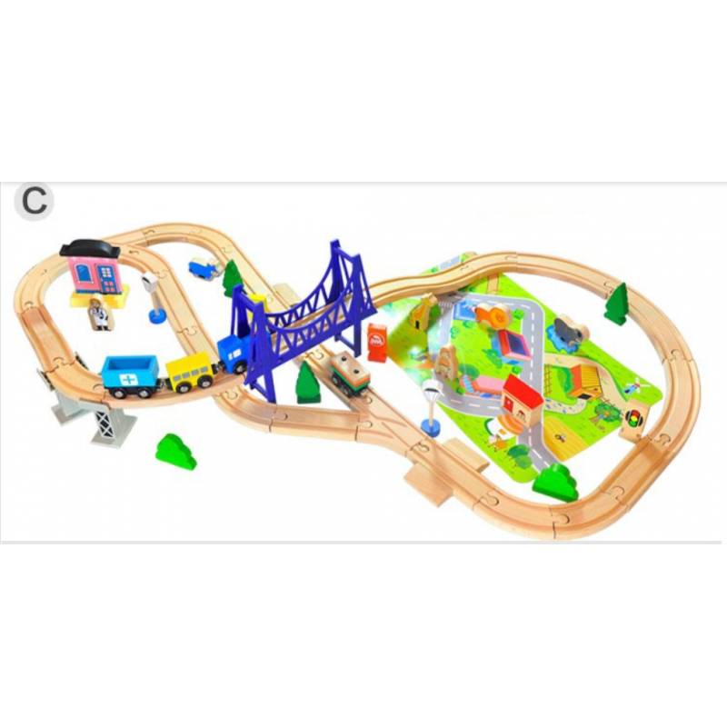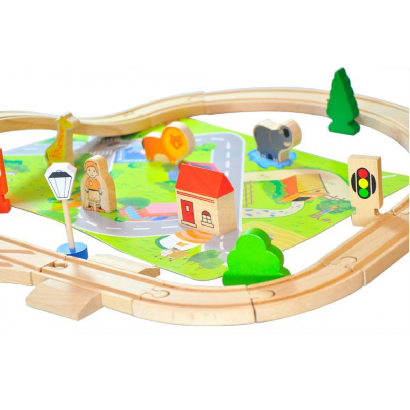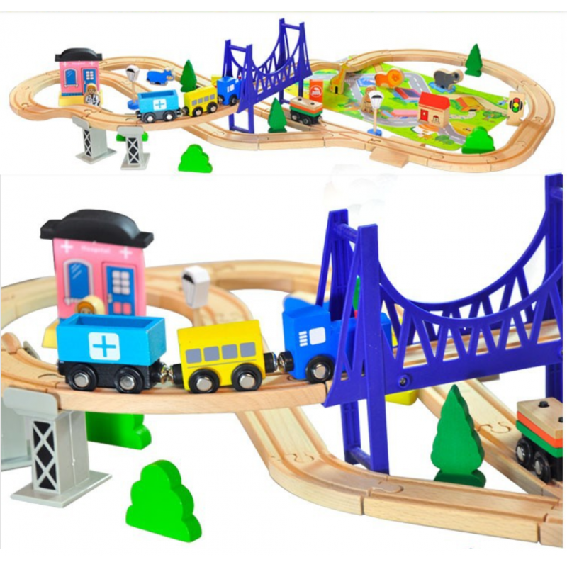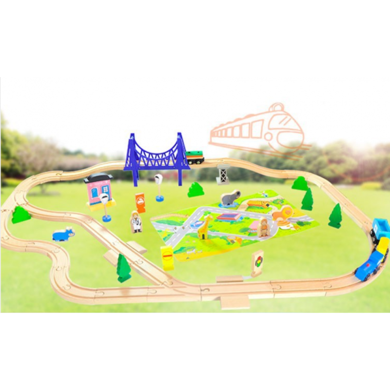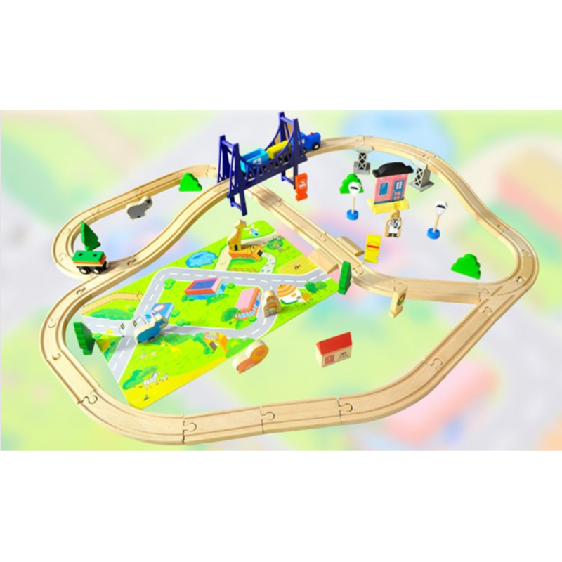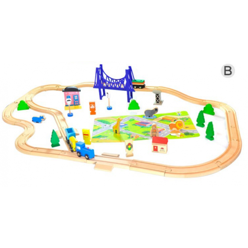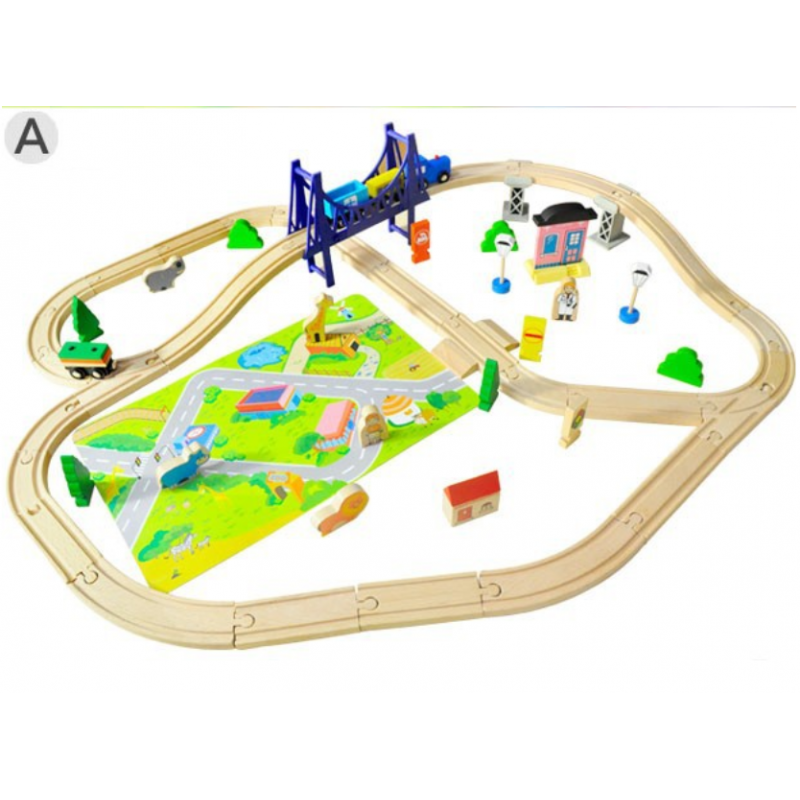 Produs: Set sine trenulete accesorii : Wooden Train Set 65 piese