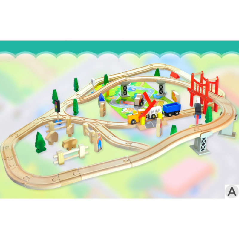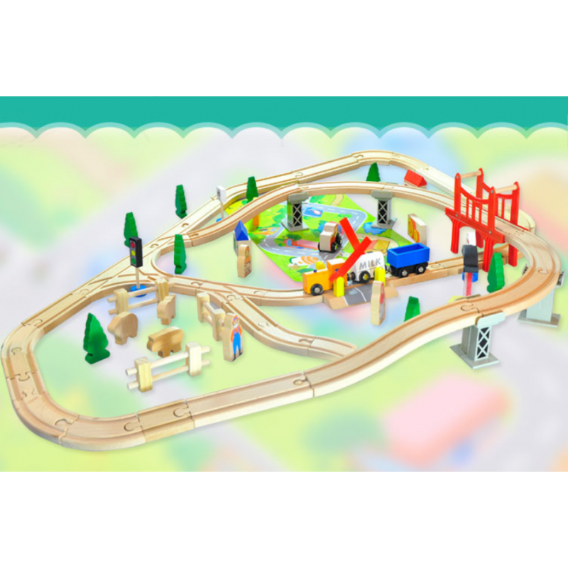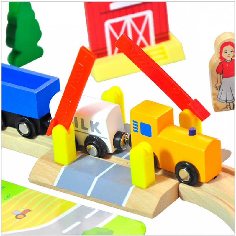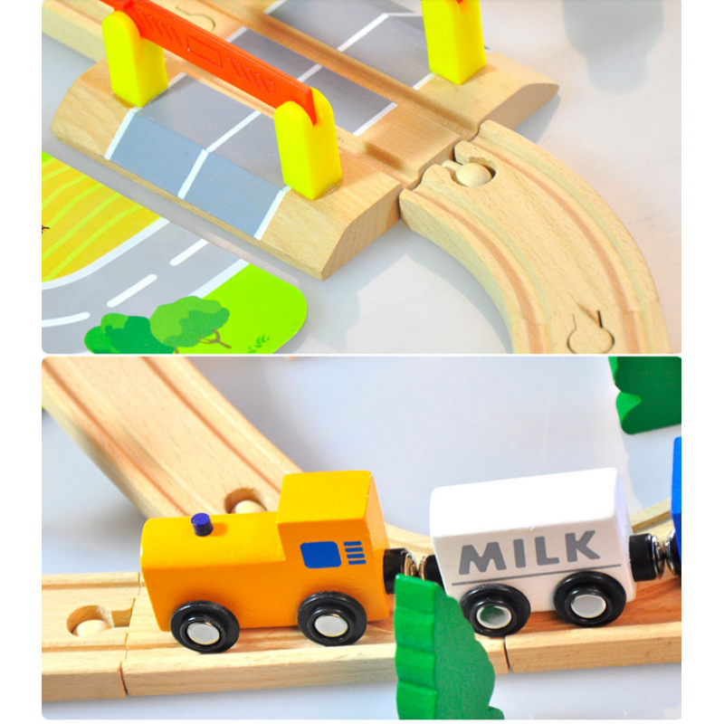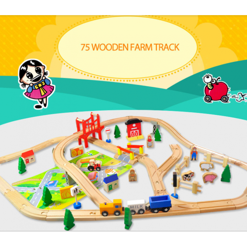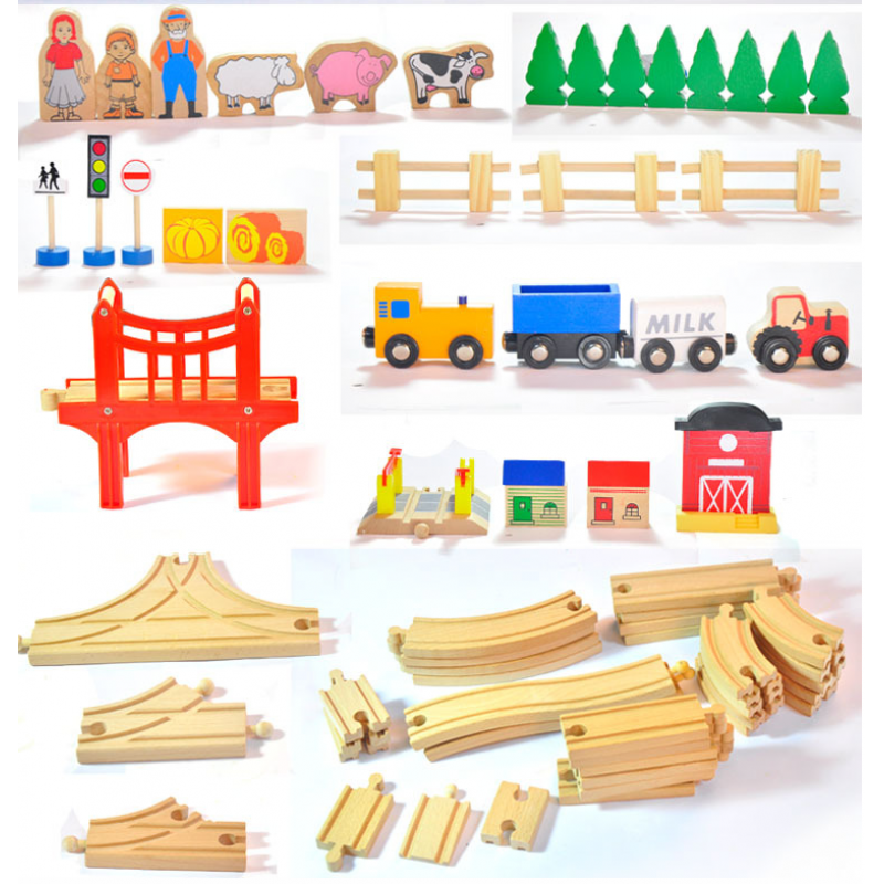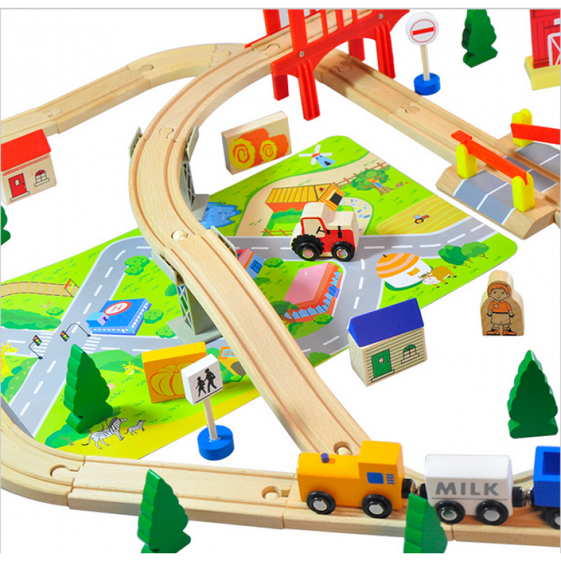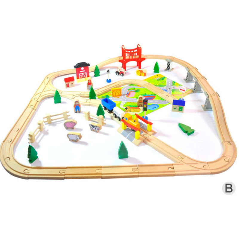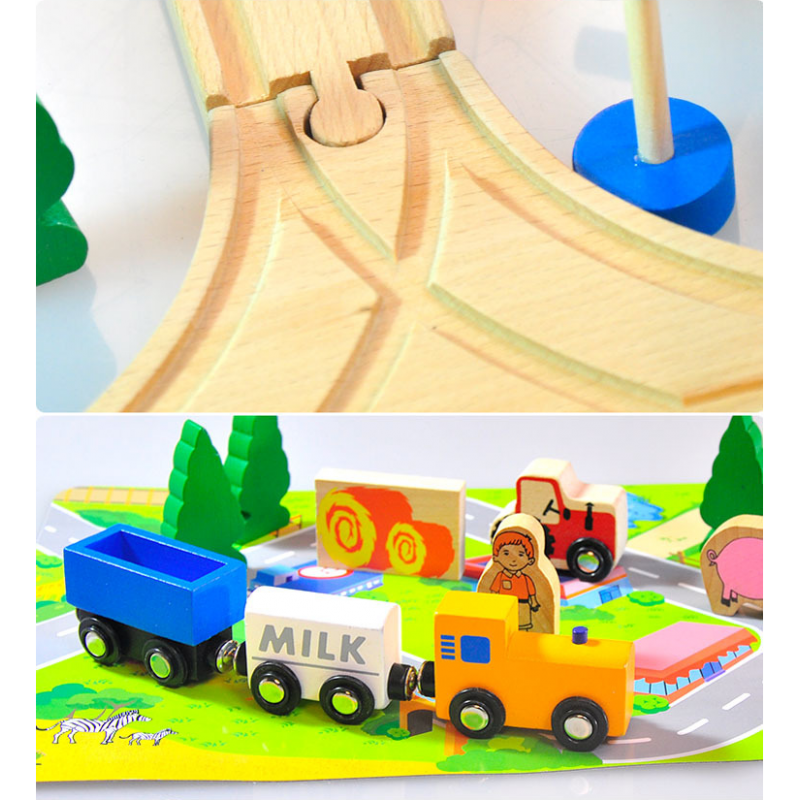 Produs: Set sine trenulete accesorii : Wooden Farm Track - pe doua nivele - 75 piese