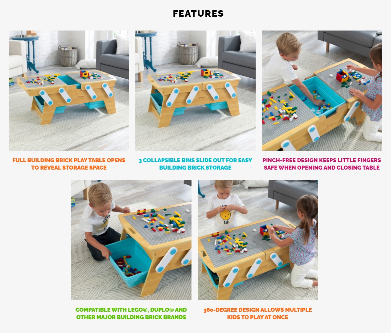- Compatibil cu LEGO®, DUPLO® și alte mărci importante de cărămizi pentru construcții