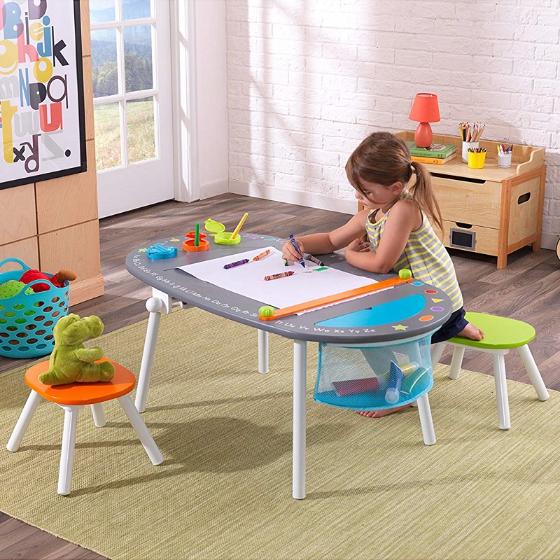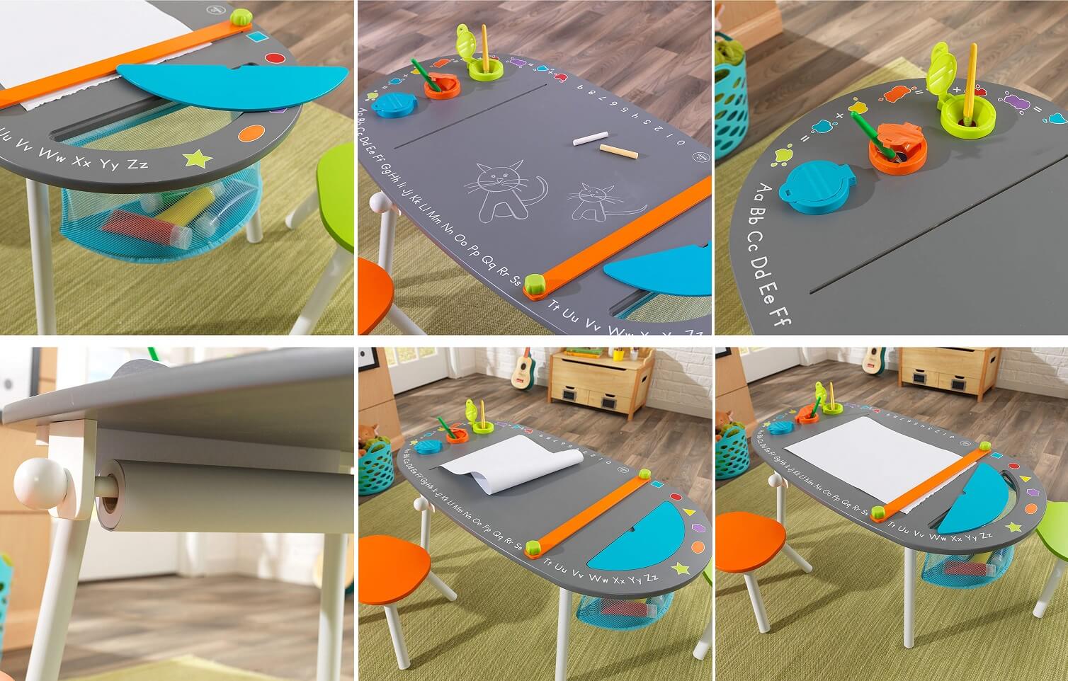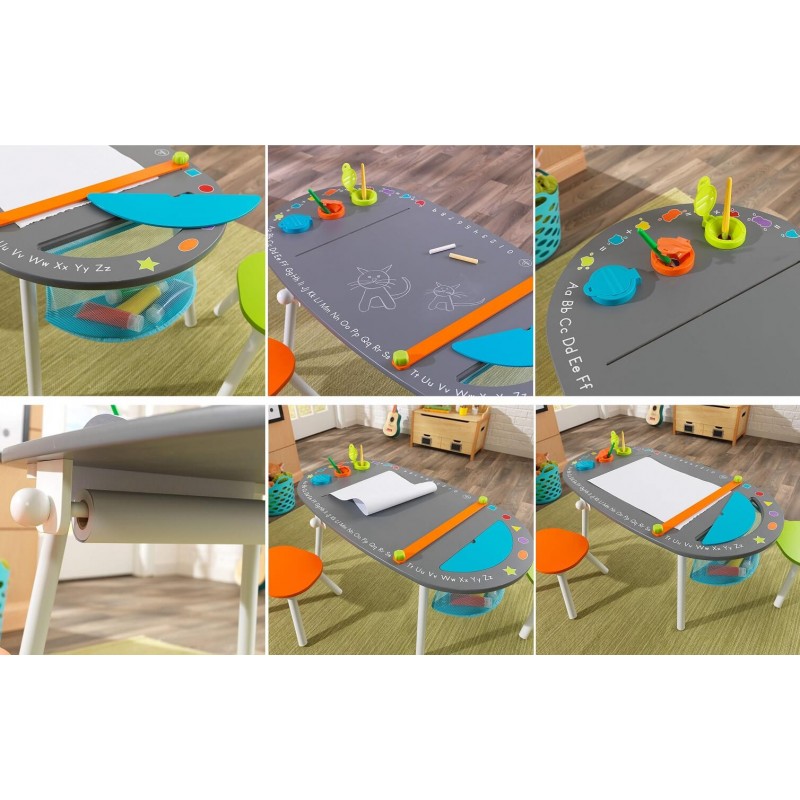 Chalkboard Art Table – Kidkraft cu taburete va fi centrul creativ al oricarei camere de joaca. Un rulou de hartie de arta se monteaza sub masa, se alimenteaza printr-o fanta si se fixeaza pe o suprafata de lucru sigura. Un trio de pahare cu vopsea bine sigilata impotriva scurgerilor, pastreaza vopsea proaspata . Un compartiment de stocare cu ochiuri de plasa pastreaza consumabilele, astfel incat micii artisti isi pot pastra spatiul de lucru curat. Masa este acoperita cu tabla acopera asigura un aspect elegant iubit deopotriva de copiii si parinti.