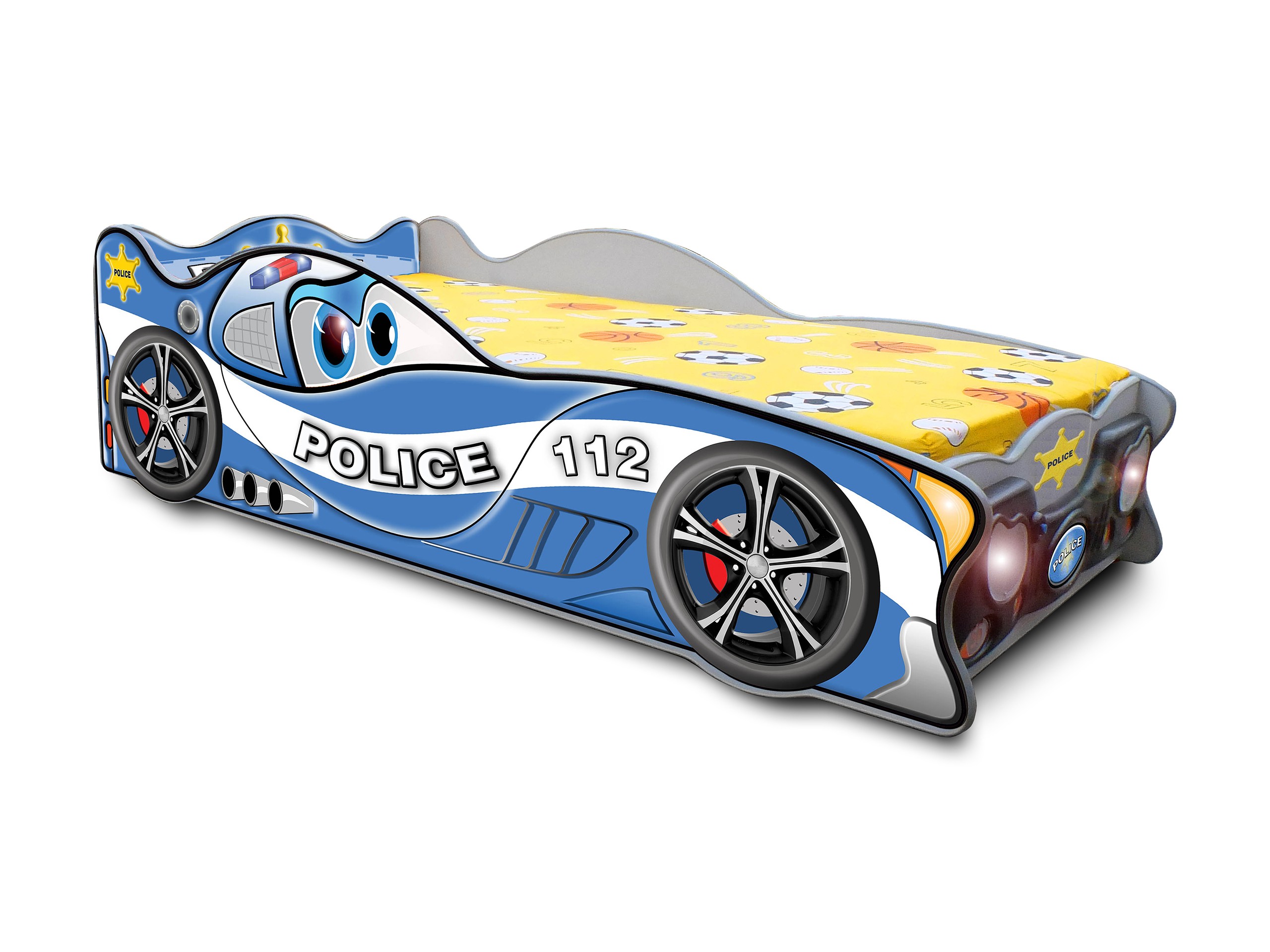 Un pat pentru copii în formă de mașină de politie. Patul are si saltea inclusa. Mobilierul este realizat din lemn cu grosimea de 18 mm , marginile sunt fixate cu badou de protectie cauciuct. Culorile se desenele de blaturile laterale ale patutului sunt laminate pentru protejeaza împotriva apei și UV.
