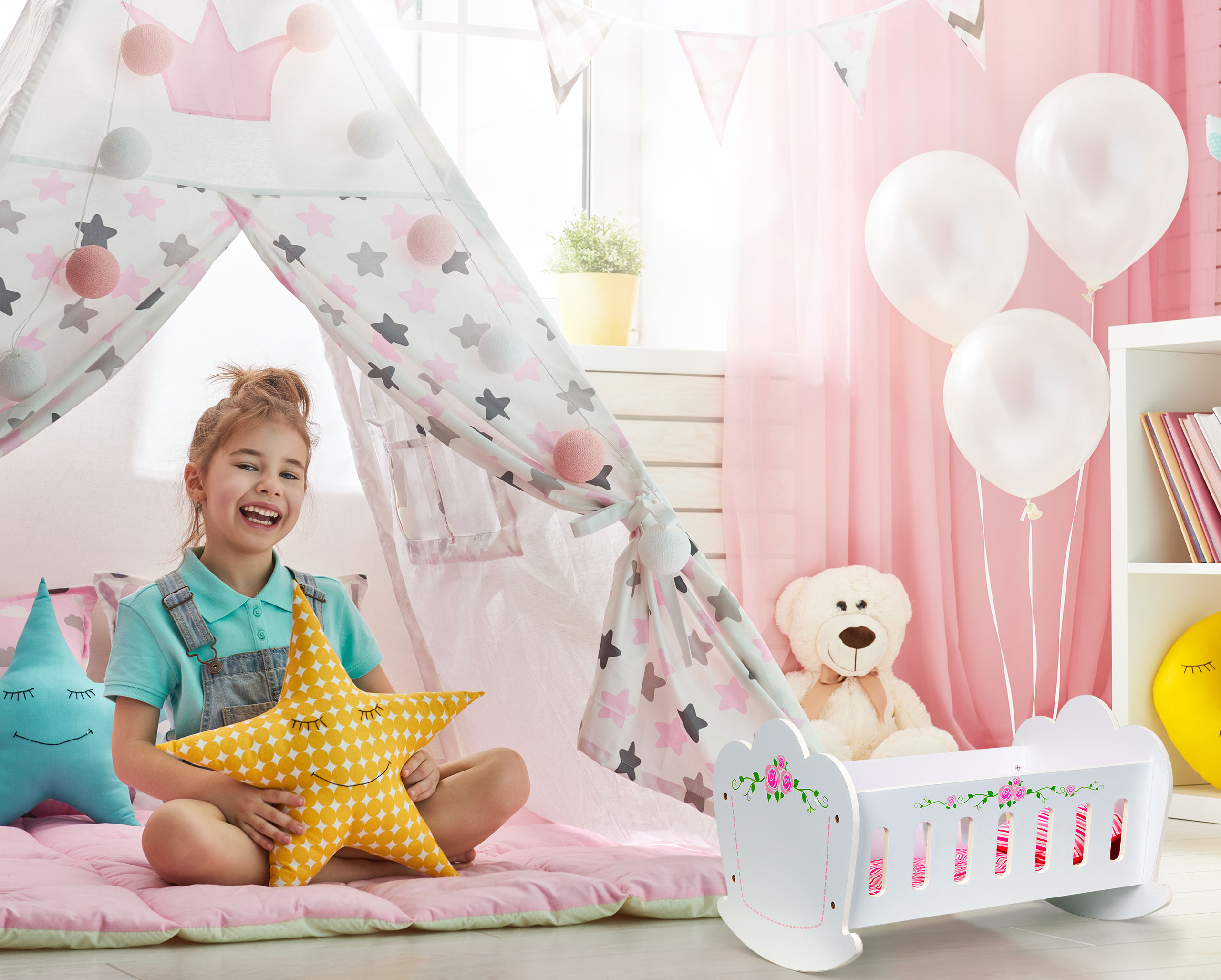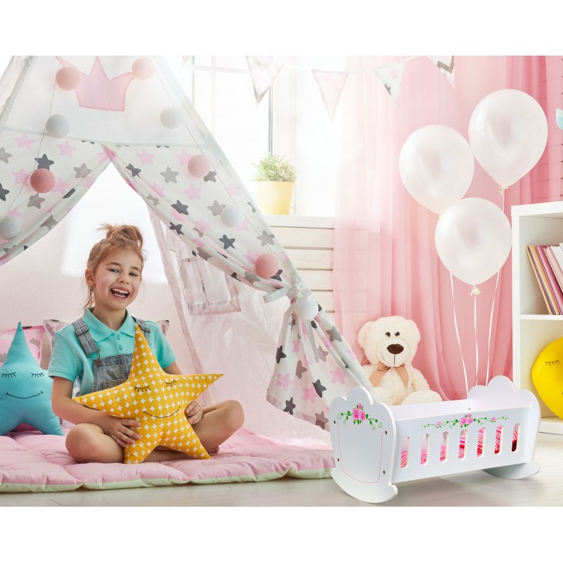 Patutul din lemn cu balans pentru papusi este fara indoiala un accesoriu ideal pentru orice camera de copil.
