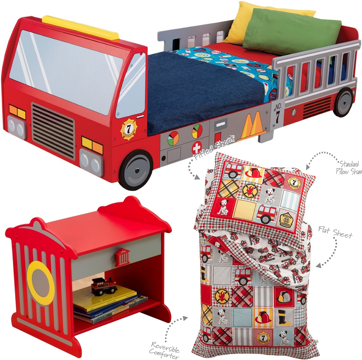 Set Fire Truck - 5 piese (pat masina de pompier, lenjerie si noptiera, set perna si pilota, saltea)