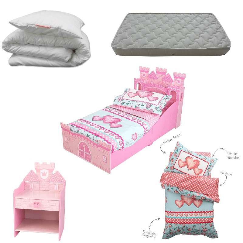 Set Mobilier Princess Castle -5 piese (pat, noptiera, lenjerie, platuma + perna, saltea)