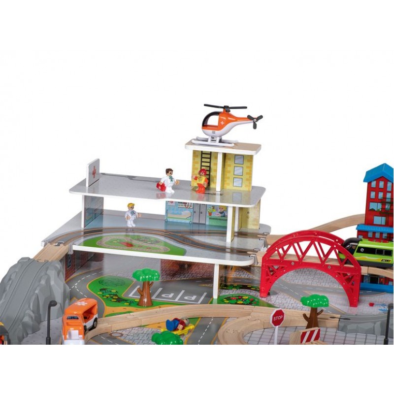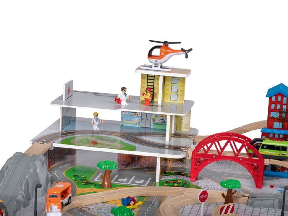Set trenulete cu baterie cu sunete si lumini garaj masinute si trenulete cu 3 nivele Heliport Station