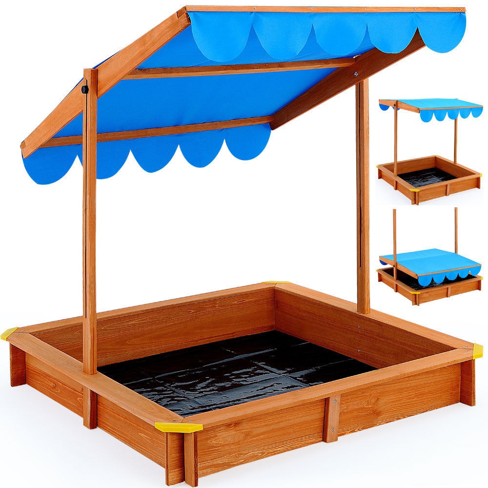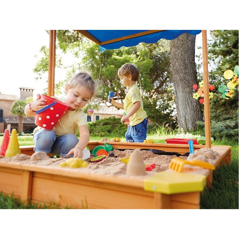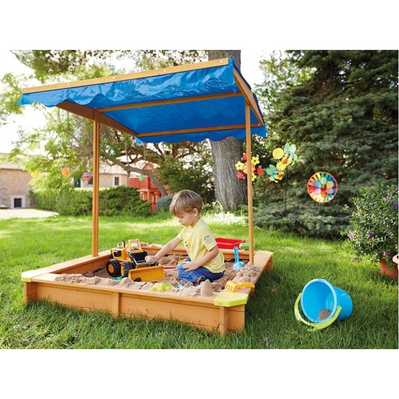 Spatiu de joaca cu nisip - Lada cu nisip din lemn pentru gradina, acoperita cu copertina albastra retractabila UV
