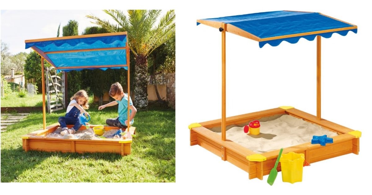 Produs: Spatiu de joaca cu nisip - Lada cu nisip din lemn pentru gradina, acoperita cu copertina retractabila UV 50+