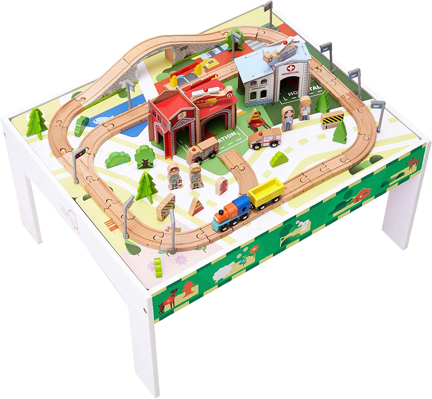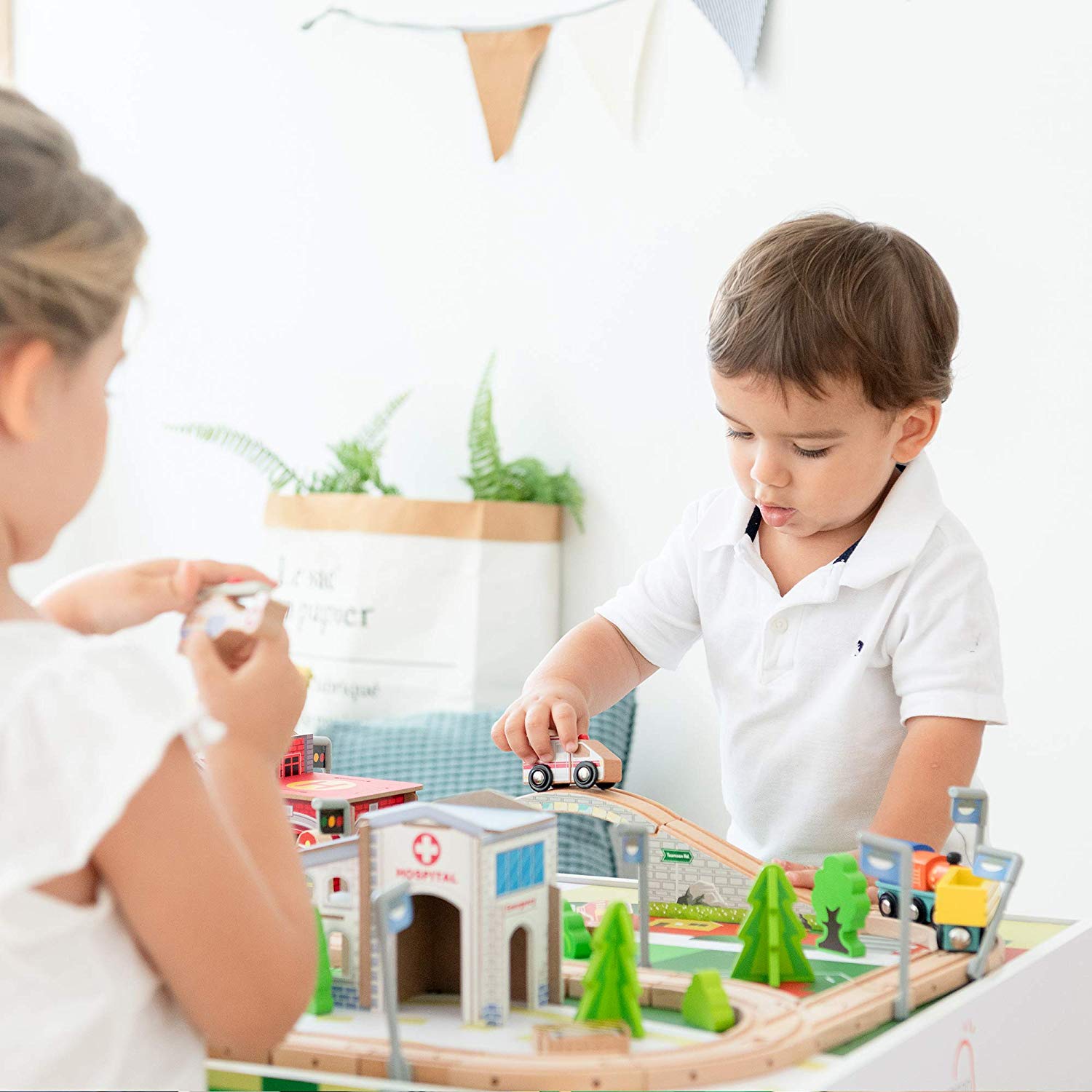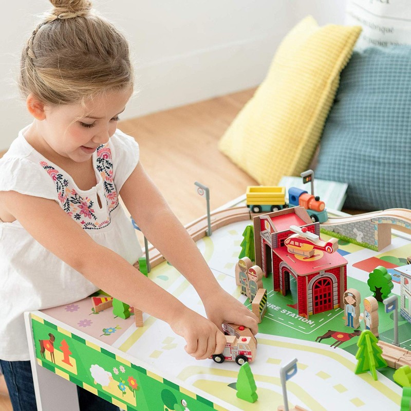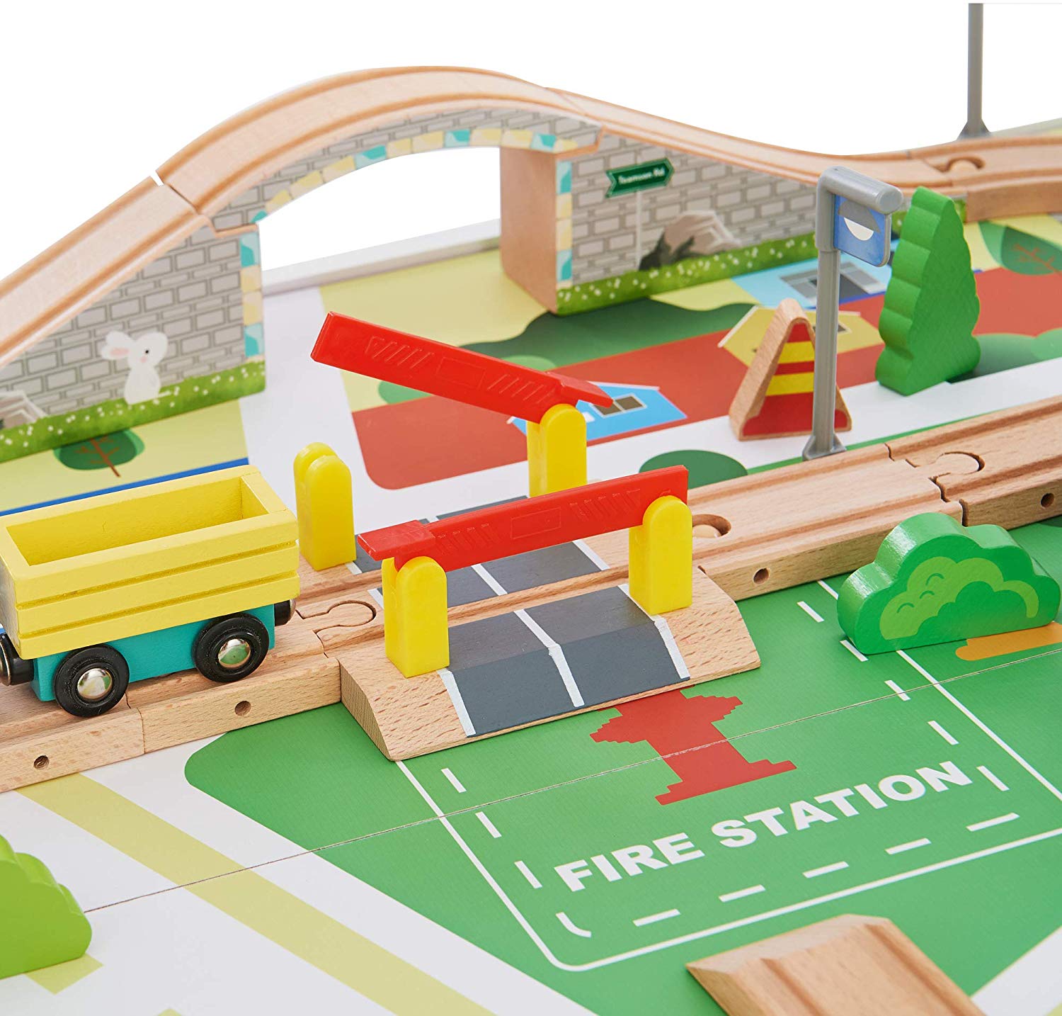 Set trenulete accesorii / Green City Train Set cu masuta de joaca - pe doua nivele, cu diverse trasee si puncte de interes si o multime de accesorii.