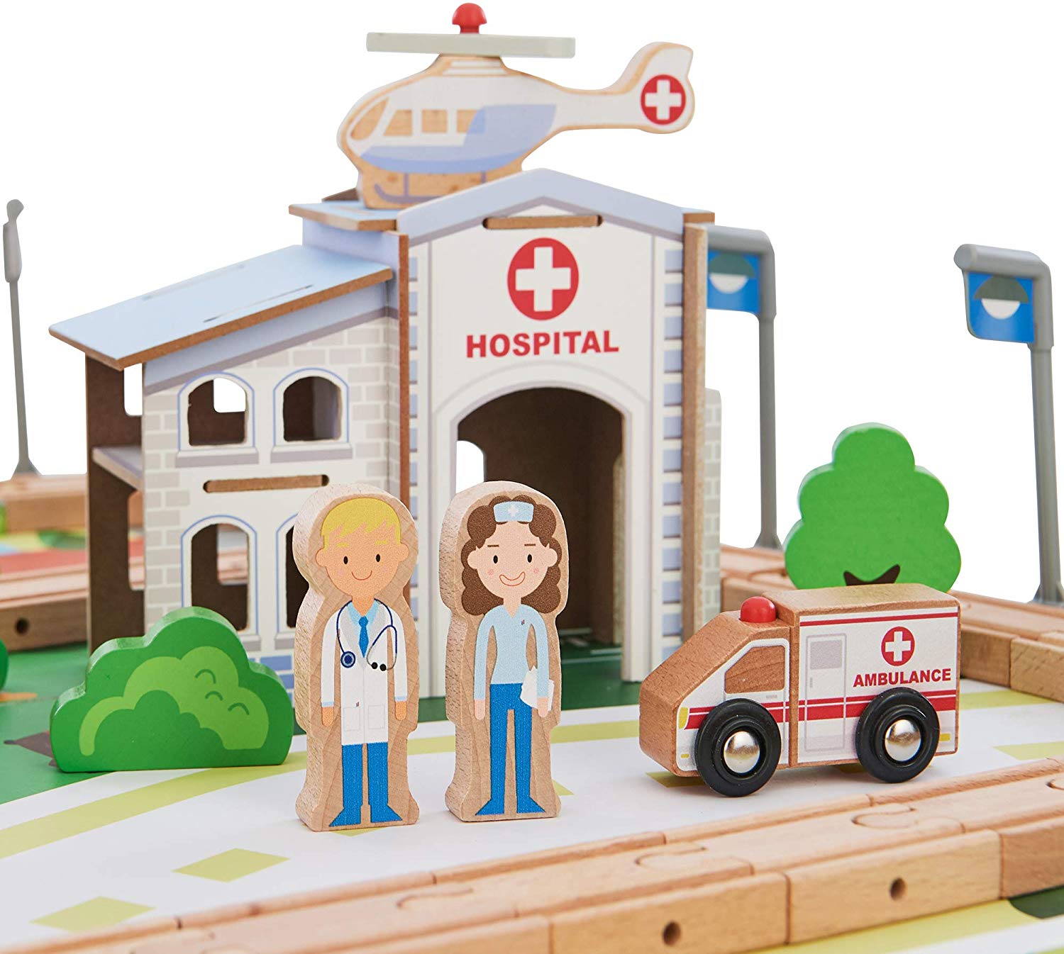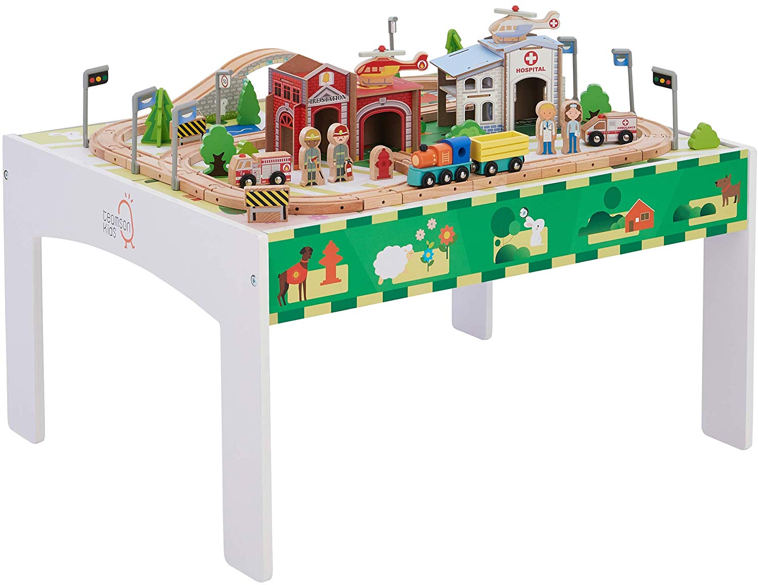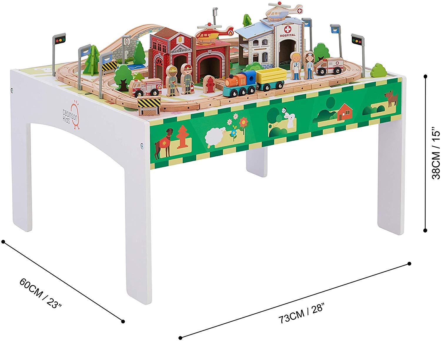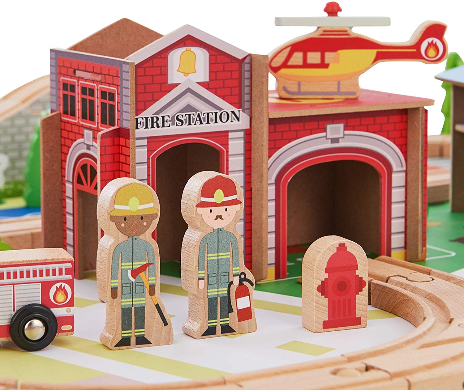 Set trenulete accesorii / Green City Train Set cu masuta de joaca - pe doua nivele, cu diverse trasee si puncte de interes si o multime de accesorii.