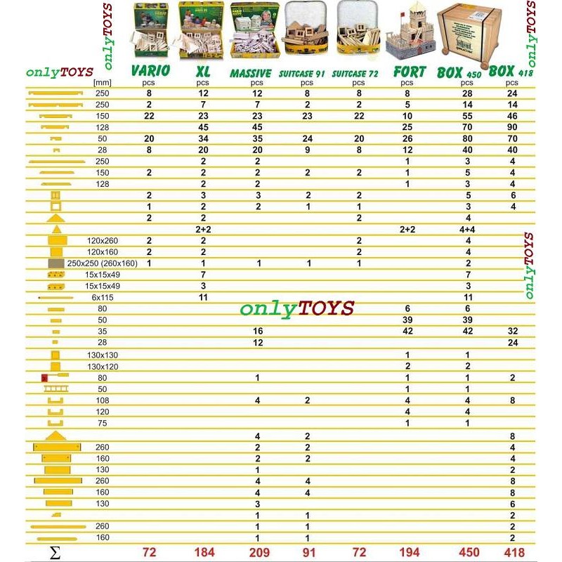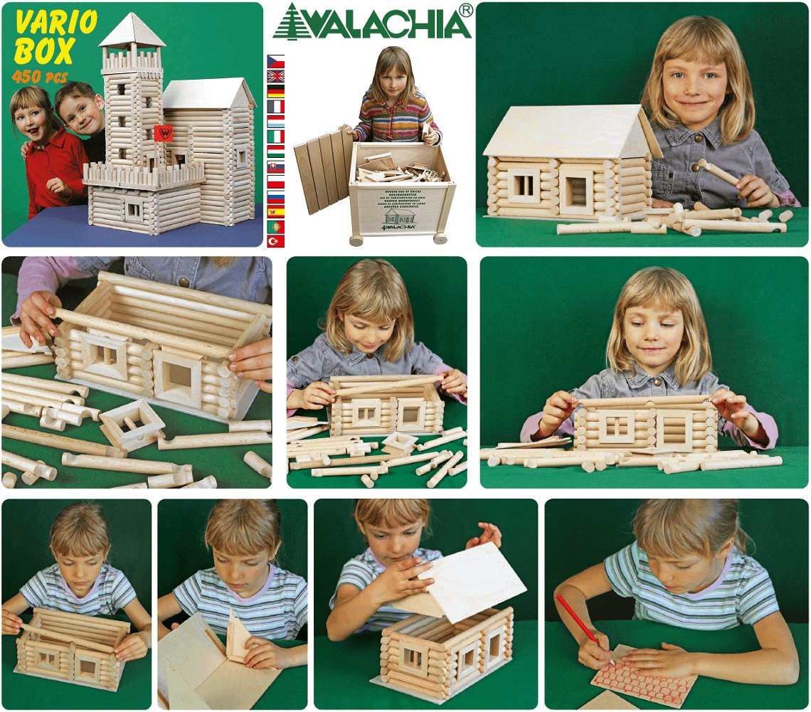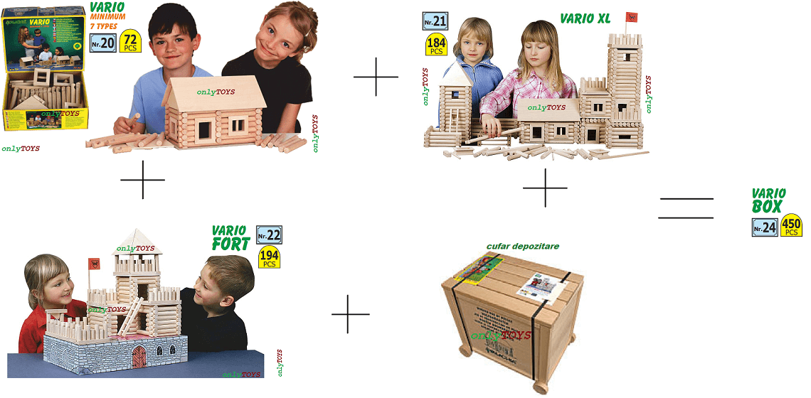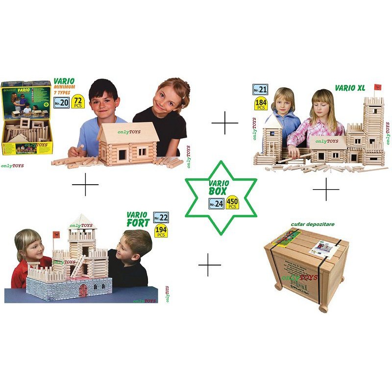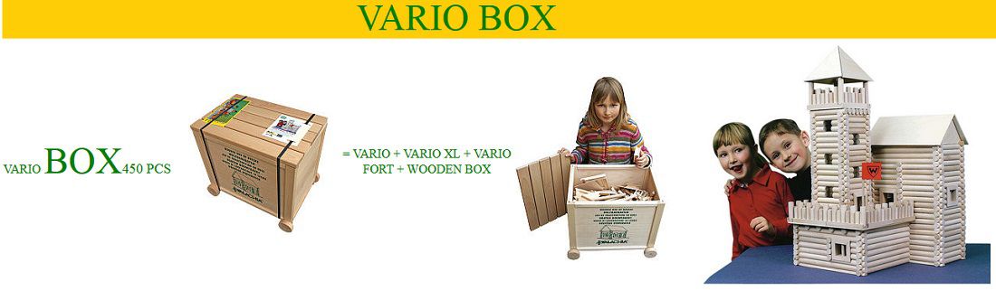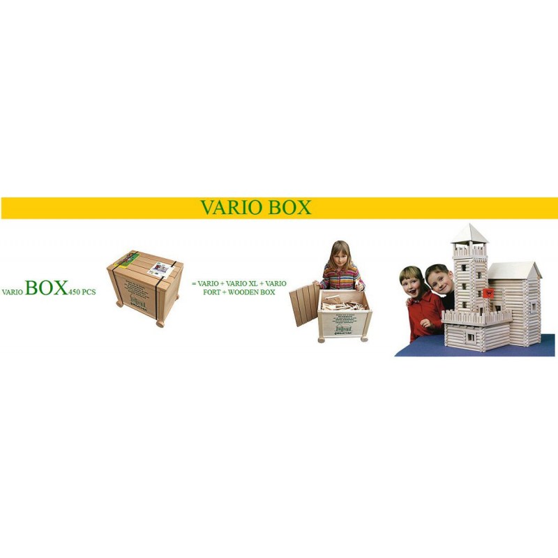 Setul Vario BOX este cel mai mare set din gama Vario si contine: 450 de piese din lemn natur de fag (diametru: 15 mm, diferite lungimi), ce au la capete un sistem de imbinare care permite asamblarea structurii de baza fara lipici, usi, ferestre si alte componente necesare finalizarii constructiilor.