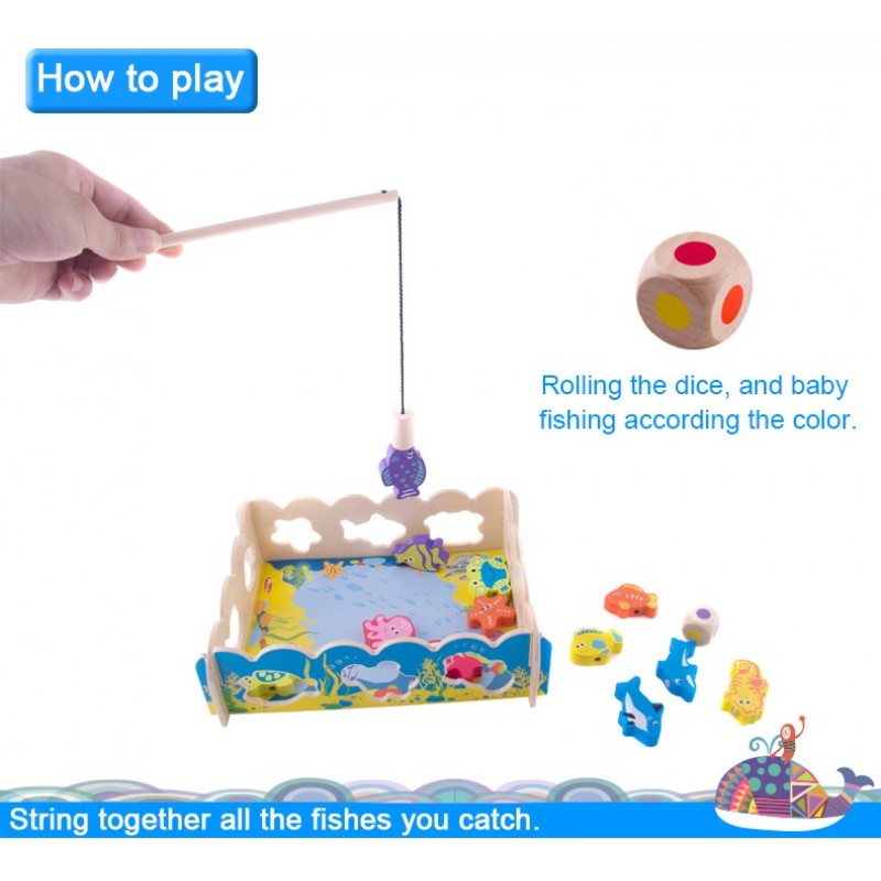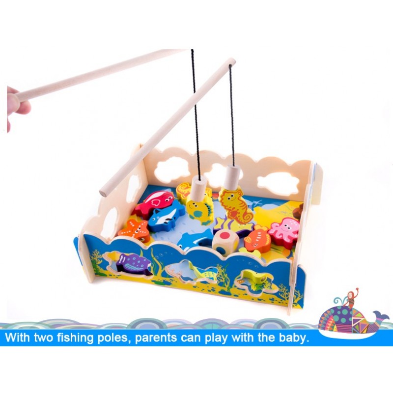 Acest joc de pescuit magnetic din lemn este dedicat copiilor intre 3 - 6 ani și caracteristica specială a sa este că piesele se află într-un ”lac” - ramă de lemn ornata frumos, pliabila. Jocul trebuie deci să înceapă cu îmbinarea elementelor, care se face foarte usor. Pentru cei mai mici, este nevoie de ajutor, dar cu timpul copiii, prin imitație, vor învăța sa faca chiar ei acest lucru.