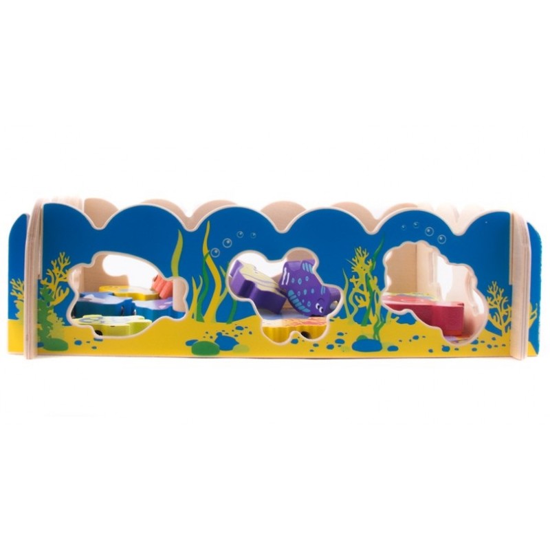 Cutia are pe margine decupaje speciale cu forme de pestisori, iar jocul se poate folosi si pentru identificarea si recunoasterea formei potrivite si pentru a introduce pestisorul potrivit in cutie.